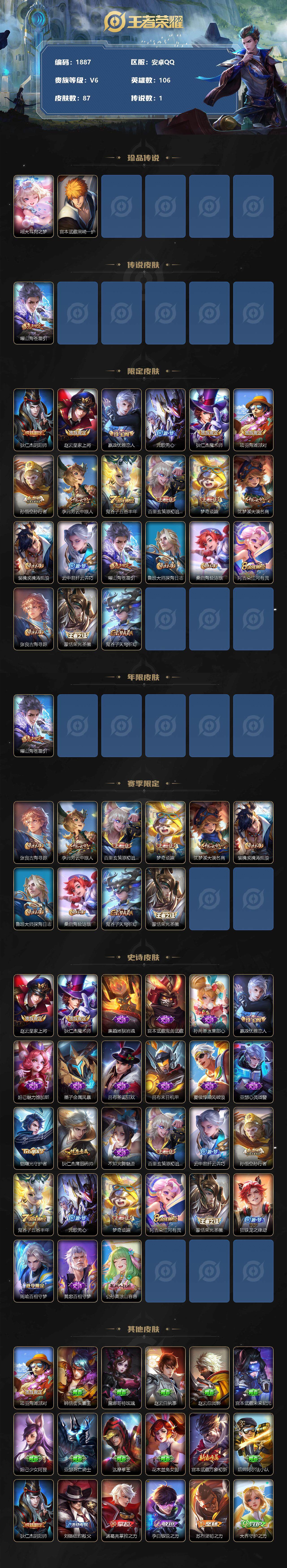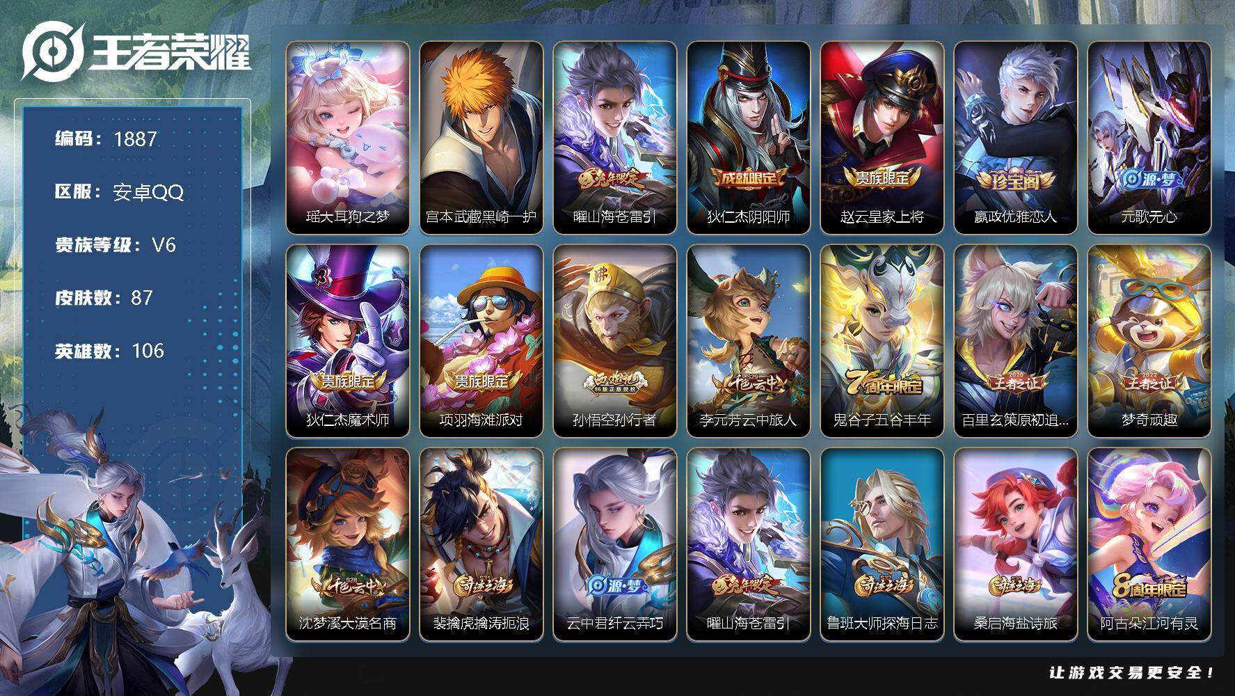 [12456186]【商品标题】:安卓Q-V6-至尊星耀IV段位-106英雄-87皮肤-0典藏-0珍品无双-0无双-2珍品传说-1传说-27史诗