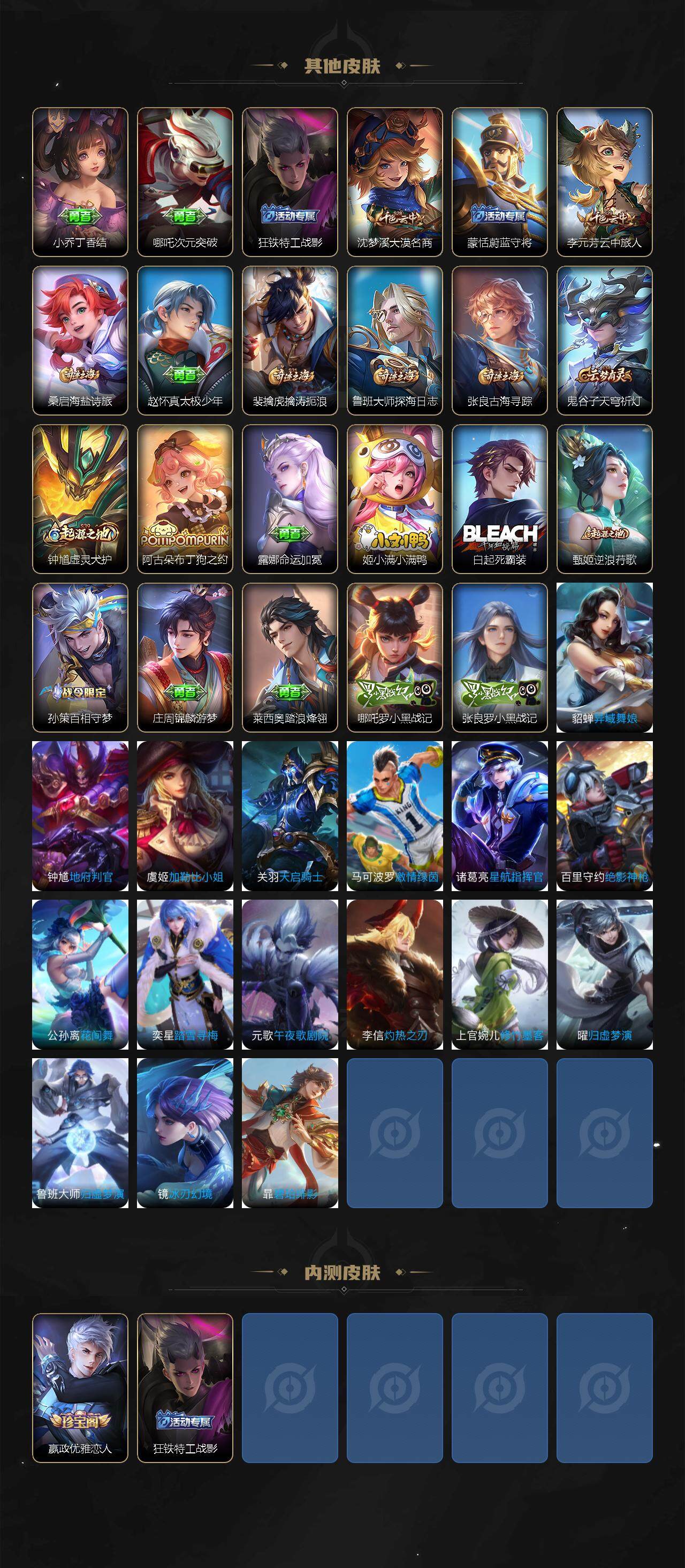 【其他皮肤】:项羽海滩派对,韩信街头霸王,露娜哥特玫瑰,赵云白执事,赵云忍炎影,宫本武藏未来纪元,妲己少女阿狸,亚瑟死亡骑士,达摩拳王,花木兰兔女郎,宫本武藏万象初新,后羿阿尔法小队,狄仁杰阴阳师,刘备纽约教父,诸葛亮掌控之力,李白敏锐之力,苏烈坚韧之力,大乔守护之力,小乔丁香结,哪吒次元突破,狂铁特工战影,沈梦溪大漠名商,蒙恬蔚蓝守将,李元芳云中旅人,桑启海盐诗旅,赵怀真太极少年,裴擒虎擒涛扼浪,鲁班大师探海日志,张良古海寻踪,鬼谷子天穹祈灯,钟馗虚灵犬护,阿古朵布丁狗之约,露娜命运加冕,姬小满小满鸭,白起死霸装,甄姬逆浪荇歌,孙策百相守梦,庄周锦麟游梦,莱西奥踏浪烽翎,哪吒罗小黑战记,张良罗小黑战记,貂蝉异域舞娘,钟馗地府判官,虞姬加勒比小姐,关羽天启骑士,马可波罗激情绿茵,诸葛亮星航指挥官,百里守约绝影神枪,公孙离花间舞,弈星踏雪寻梅,元歌午夜歌剧院,李信灼热之刃,上官婉儿修竹墨客,曜归虚梦演,鲁班大师归虚梦演,镜冰刃幻境,暃碧珀绯影