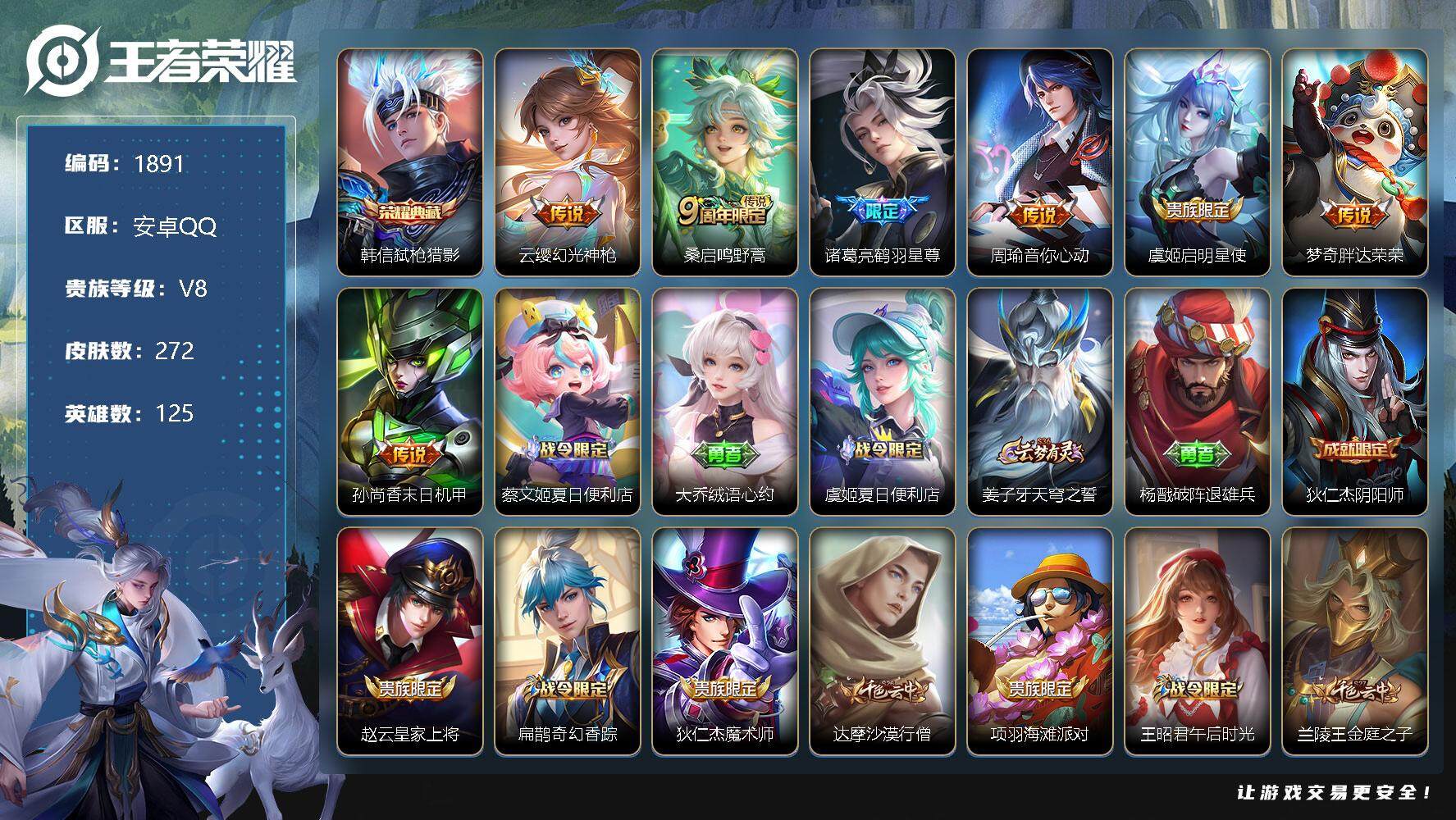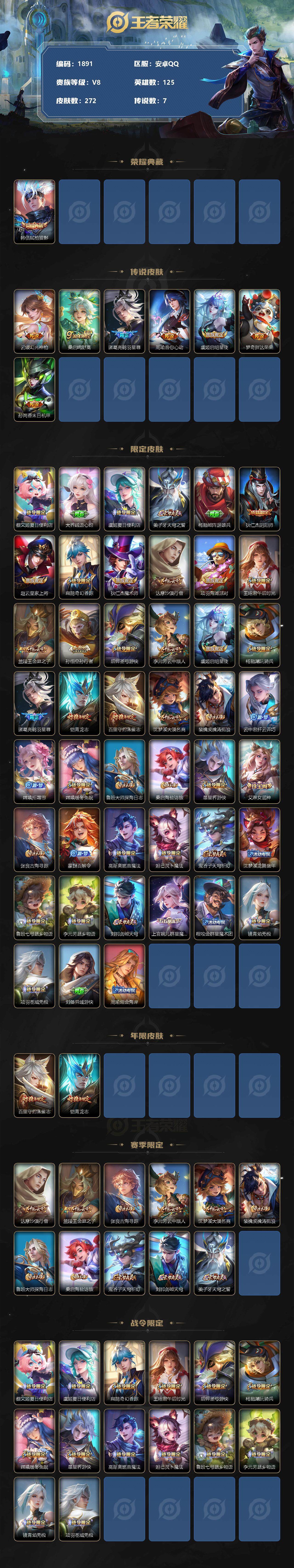 [12456634]【商品标题】:安卓Q-V8-尊贵铂金I段位-125英雄-272皮肤-1典藏-0珍品无双-0无双-0珍品传说-7传说-52史诗