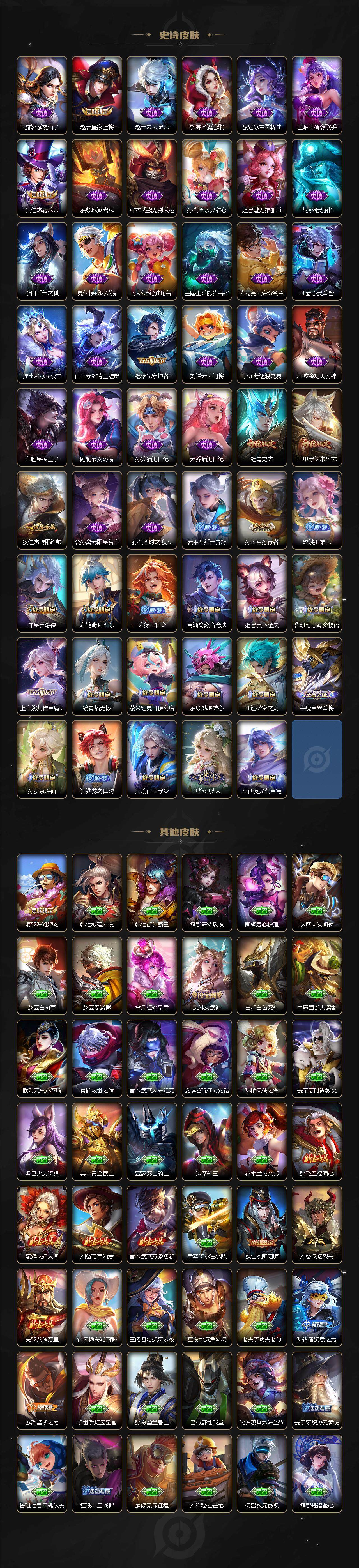 【史诗皮肤】:露娜紫霞仙子,赵云皇家上将,赵云未来纪元,貂蝉圣诞恋歌,甄姬冰雪圆舞曲,王昭君偶像歌手,狄仁杰魔术师,廉颇地狱岩魂,宫本武藏鬼剑武藏,孙尚香水果甜心,妲己魅力维加斯,曹操幽灵船长,李白千年之狐,夏侯惇乘风破浪,小乔缤纷独角兽,兰陵王暗隐猎兽者,诸葛亮黄金分割率,亚瑟心灵战警,雅典娜冰冠公主,百里守约特工魅影,铠曙光守护者,刘禅天才门将,李元芳逐浪之夏,程咬金功夫厨神,白起星夜王子,阿轲节奏热浪,孙策猫狗日记,大乔猫狗日记,铠青龙志,百里守约朱雀志,狄仁杰鹰眼统帅,公孙离无限星赏官,孙尚香时之恋人,云中君纤云弄巧,孙悟空孙行者,嫦娥拒霜思,暃星界游侠,扁鹊奇
