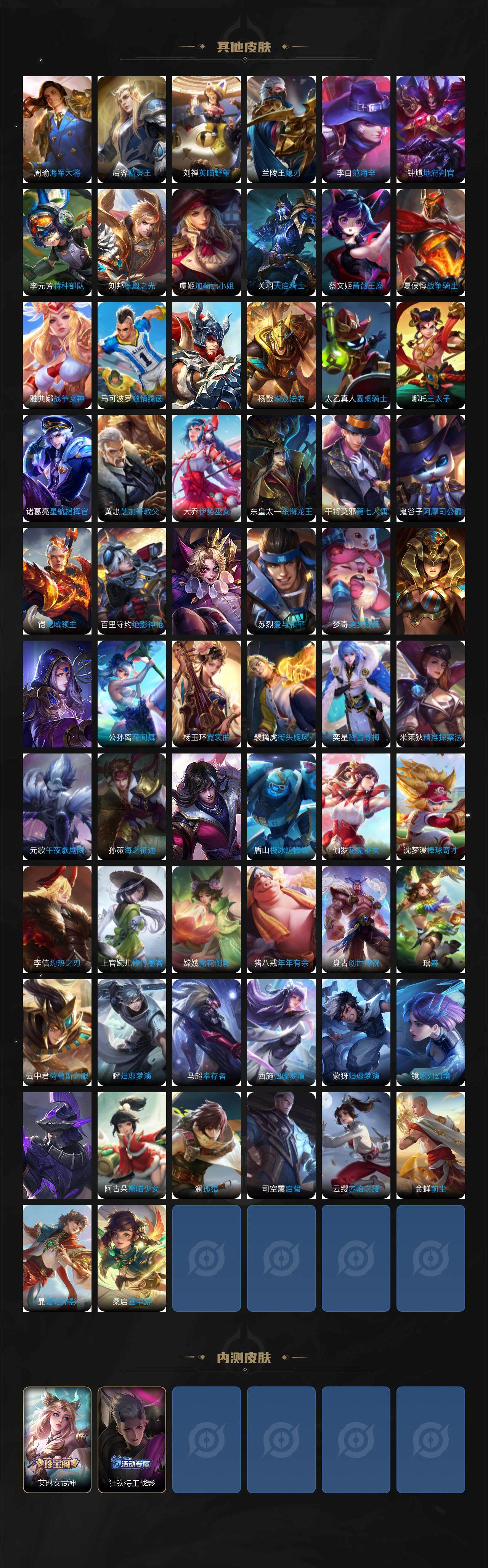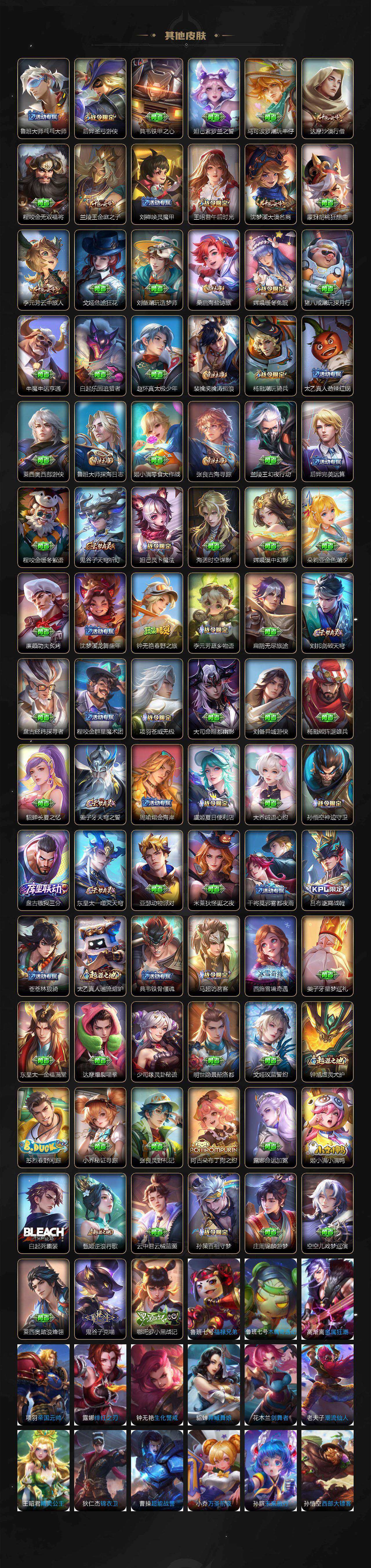 【限定皮肤】:蔡文姬夏日便利店,大乔绒语心约,虞姬夏日便利店,姜子牙天穹之誓,杨戬破阵退雄兵,狄仁杰阴阳师,赵云皇家上将,扁鹊奇幻香踪,狄仁杰魔术师,达摩沙漠行僧,项羽海滩派对,王昭君午后时光,兰陵王金庭之子,孙悟空孙行者,后羿圣弓游侠,李元芳云中旅人,虞姬启明星使,杨戬潮玩骑兵,诸葛亮鹤羽星尊,铠青龙志,百里守约朱雀志,沈梦溪大漠名商,裴擒虎擒涛扼浪,云中君纤云弄巧,嫦娥拒霜思,嫦娥暖冬兔眠,鲁班大师探海日志,桑启海盐诗旅,暃星界游侠,艾琳女武神,张良古海寻踪,蒙犽百解令,高渐离燃音魔法,妲己灵卜魔法,鬼谷子天穹祈灯,沈梦溪龙舞盛年,鲁班七号蔬乡物语,李元芳蔬乡物语,刘邦剑破天穹,上官婉儿群星魔术团,程咬金群星魔术团,镜青焰无极,项羽苍威无极,刘备异域游侠,周瑜熔金海岸