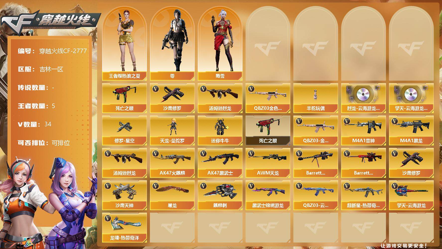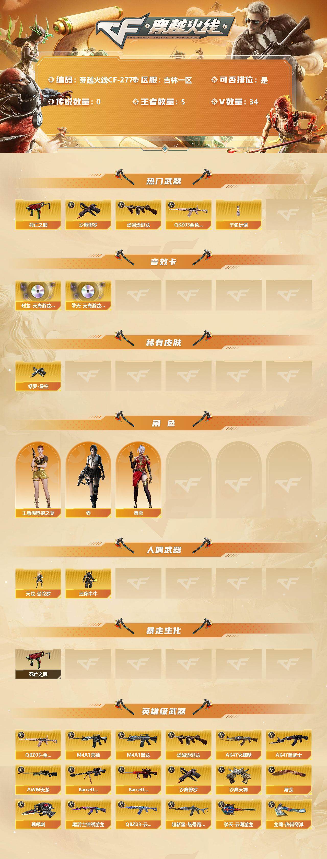 [12456621]【商品标题】:吉林一区-34V-5王者-0炫金 【热门武器】:QBZ03-金色蔷薇,死亡之眼,汤姆逊-烈龙,羊驼玩偶,沙鹰-修罗*2 【音效卡】:烈龙-云海游龙音效卡,擎天-云海游龙音效卡 【稀有皮肤】:修罗-星空 【角色】:王者樱-热浪之夏,零,蜀雪 【人偶武器】:天龙-曼陀罗,迷你牛牛 【暴走生化】:死亡之眼 【英雄级武器】:QBZ03-云龙,QBZ03-金色蔷薇,M4A1-雷神*2,M4A1-黑龙,汤姆逊-烈龙,AK47-火麒麟,AK47-黑武士,AWM-天龙,Barrett-毁灭,Barrett-极光,黑武士-锦绣游龙,超新星-热带奇洋,沙鹰-天神,沙鹰-修罗*2,麒麟刺,屠龙*2,擎天-云海游龙,龙啸-热带奇洋 【特殊枪械】:1烈龙
