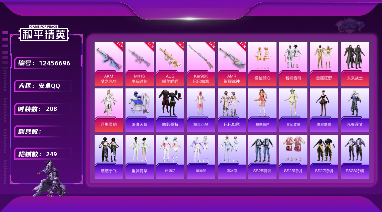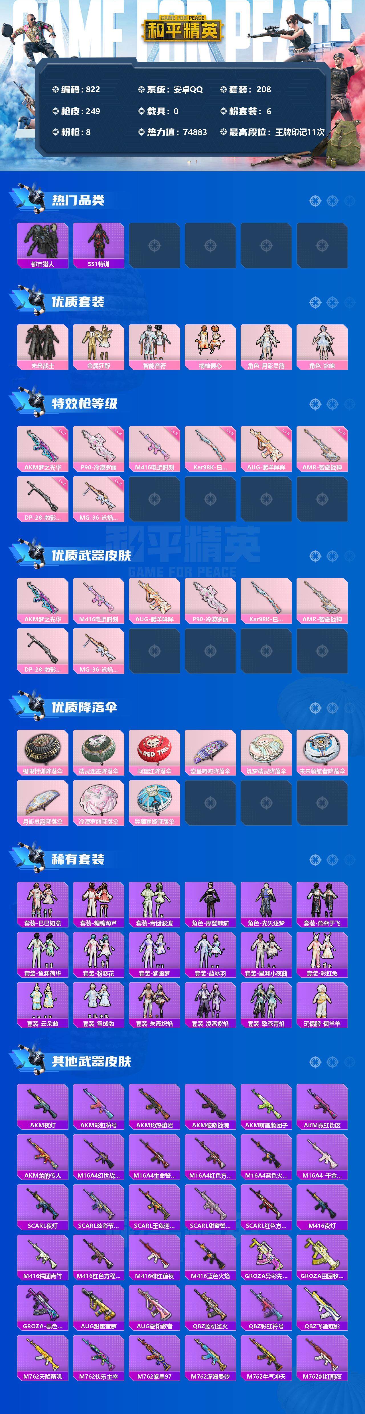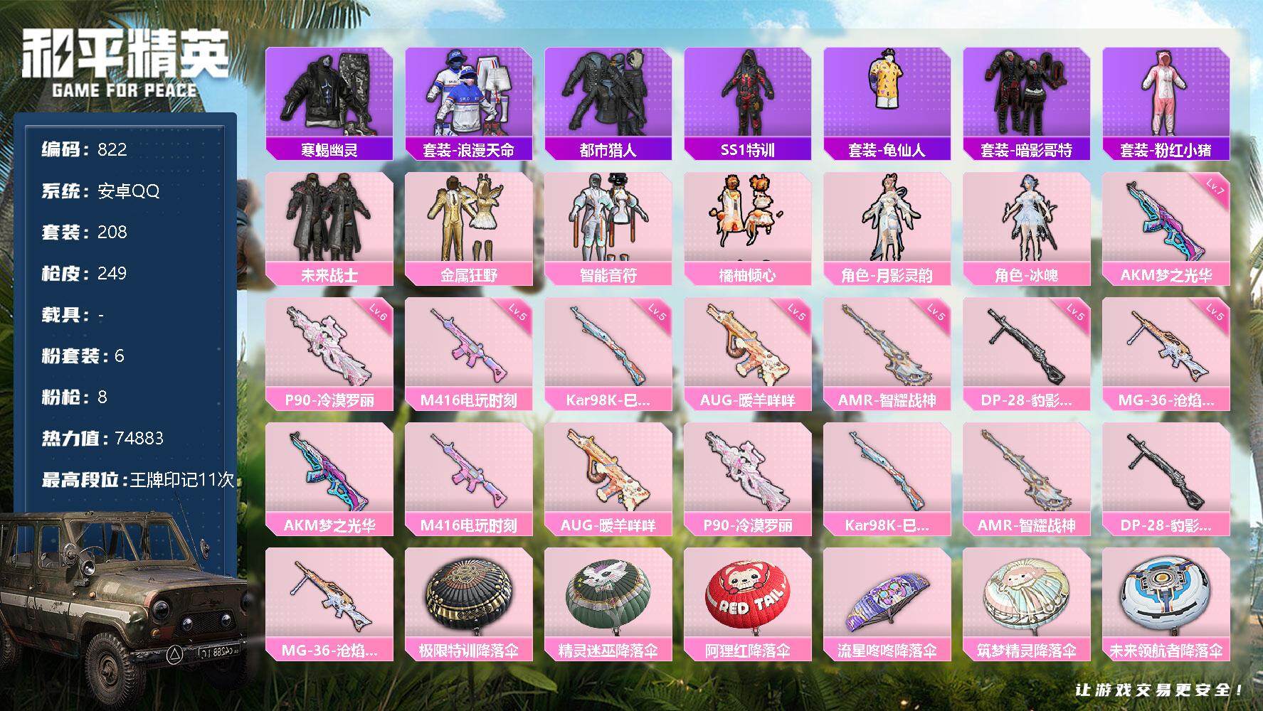 [12456696]【商品标题】:安卓 手Q-6粉装-8特效枪-0载具-0粉色飞行器-74883热力值-11王牌印记-208套装-249枪皮 【热门品类】:套装-寒蝎幽灵,套装-浪漫天命,套装-都市猎人,套装-SS1特训,套装-龟仙人,套装-暗影哥特,套装-粉红小猪 【粉色套装】:粉装-未来战士,粉装-金属狂野,粉装-智能音符,粉装-橘柚倾心,角色-月影灵韵,角色-冰魄 【粉色枪皮等级】:AKM-梦之光华(七级),M416-电玩时刻(五级),AUG-暖羊咩咩(五级),P90-冷漠罗丽(六级),Kar98K-巳巳如意(五级),AMR-智耀战神(五级),DP-28-豹影疾电(五级),MG-36-沧焰双生(五级) 【粉色枪皮】:AKM-梦之光华,M416-电玩时刻,AUG-暖羊咩咩,P90-冷漠罗丽,Kar98K-巳巳如意,AMR-智耀战神,DP-28-豹影疾电,MG-36-沧焰双生 【粉色降落伞】:极限特训降落伞,精灵迷巫降落伞,阿狸红降落伞,流星咚咚降落伞,筑梦精灵降落伞,未来领航者降落伞,月影灵韵降落伞,冷漠罗丽降落伞,异瞳寒姬降落伞 【稀有套装】:套装-龟仙人,套装-巳巳如意,套装-糖糖葫芦,套装-青团波波,角色-摩登魅猫,角色-光矢逐梦,套装-燕燕于飞,套装-鱼渊荷华,套装-粉恋花,套装-紫幽梦,套装-蓝冰羽,套装-星渊小夜曲,套装-彩虹兔,套装-云朵鹅,套装-雪绒豹,套装-朱霞炽焰,套装-凌霄紫焰,套装-擎苍青焰,玩偶服-懒羊羊 【稀有枪皮】:AKM-夜灯,AKM-彩虹符号,AKM-灼热熔岩,AKM-破晓战魂,AKM-萌趣颜团子,AKM-霓虹街区,AKM-龙的传人,M16A4-幻世战舞者,M16A4-生命誓言,M16A4-红色方程式,M16A4-蓝色火焰,M16A4-千金淑猫,SCAR-L-夜灯,SCAR-L-炫彩节奏,SCAR-L-玉兔迎春,SCAR-L-甜蜜誓约,SCAR-L-红色方程式,M416-夜灯,M416-糯团青竹,M416-红色方程式,M416-绯红前夜,M416-蓝色火焰,GROZA-异彩先驱,GROZA-田园牧歌,GROZA-黑色刀锋,AUG-甜蜜菠萝,AUG-耀粉歌者,QBZ-原初圣火,QBZ-彩虹符号,QBZ-飞驰魅影,M762-天降萌叽,M762-快乐主宰,M762-拳皇97,M762-深海曼妙,M762-牛气冲天,M762-绯红前夜,M762-镭射皇者