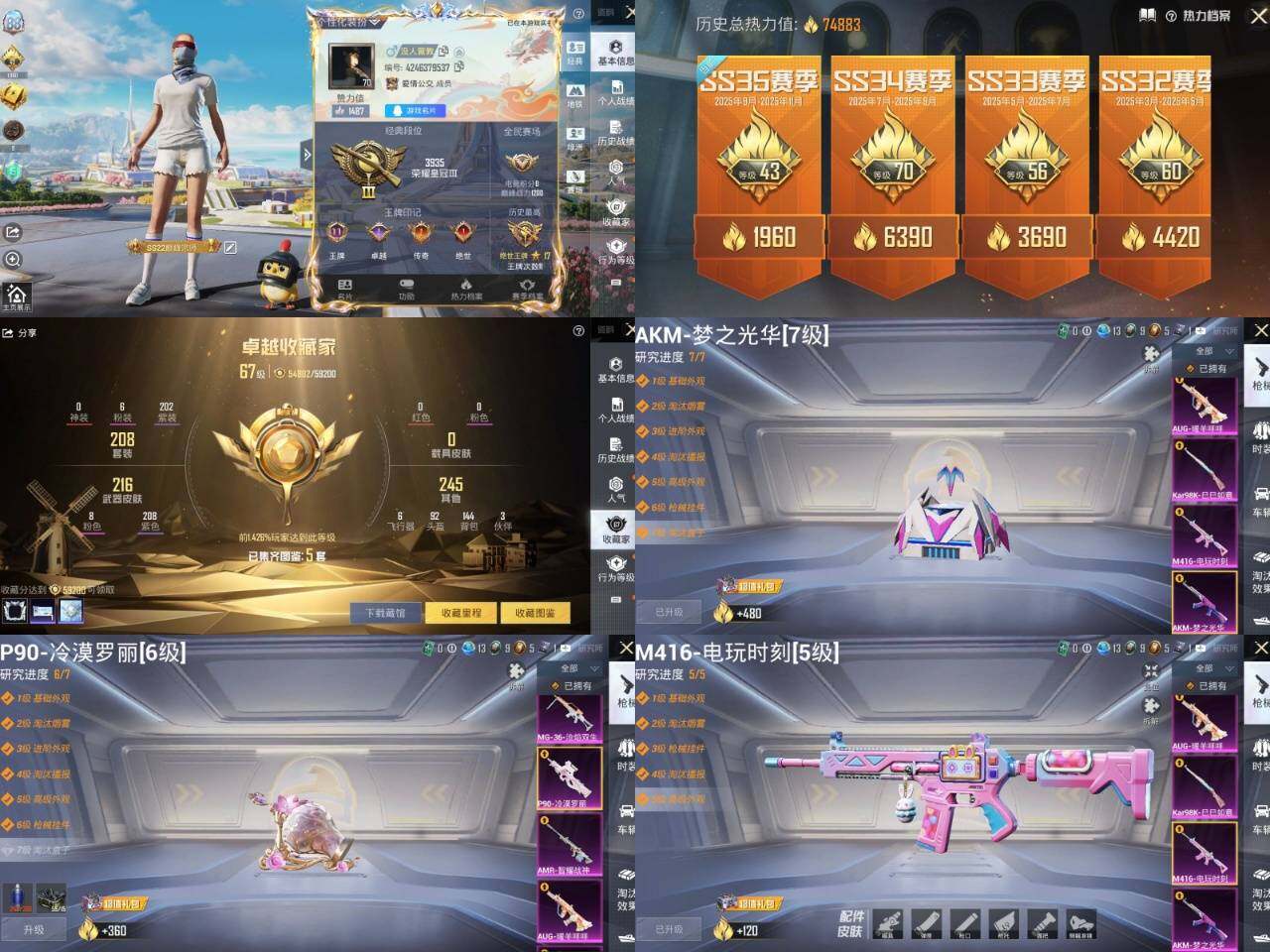 【粉色枪皮等级】:AKM-梦之光华(七级),M416-电玩时刻(五级),AUG-暖羊咩咩(五级),P90-冷漠罗丽(六级),Kar98K-巳巳如意(五级),AMR-智耀战神(五级),DP-28-豹影疾电(五级),MG-36-沧焰双生(五级)