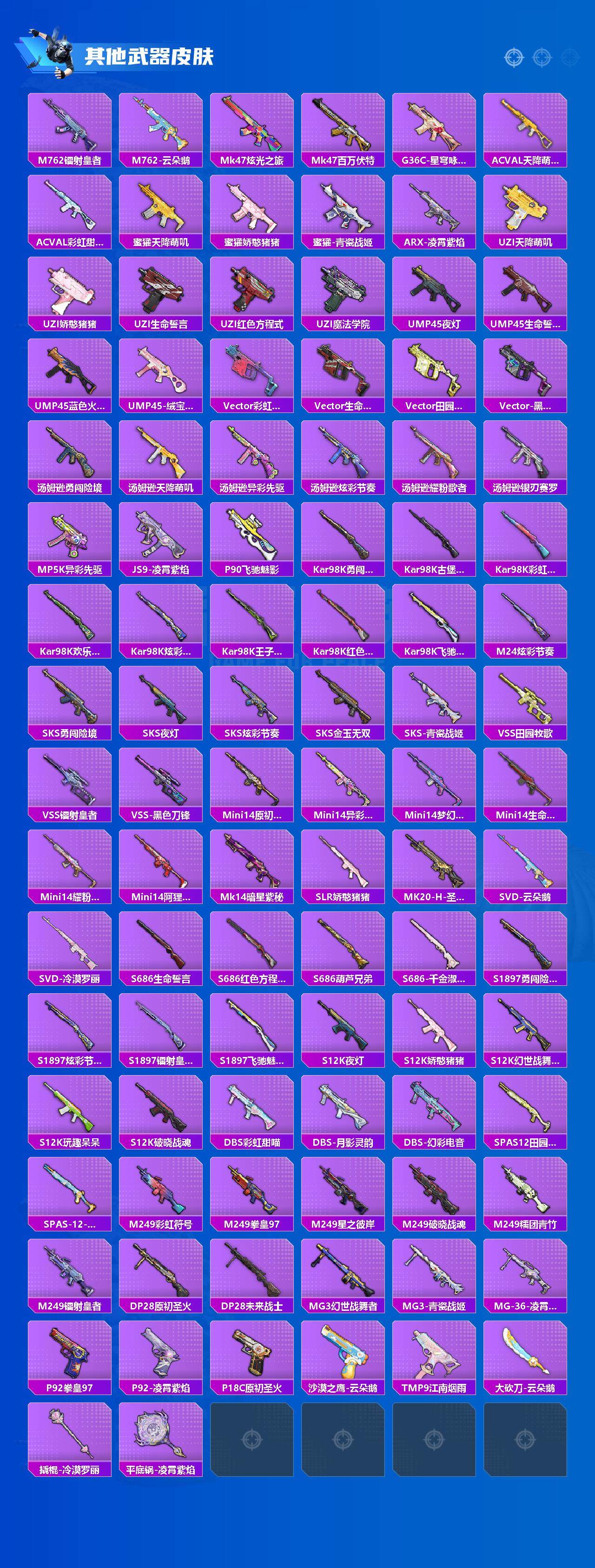 【稀有枪皮】:AKM-夜灯,AKM-彩虹符号,AKM-灼热熔岩,AKM-破晓战魂,AKM-萌趣颜团子,AKM-霓虹街区,AKM-龙的传人,M16A4-幻世战舞者,M16A4-生命誓言,M16A4-红色方程式,M16A4-蓝色火焰,M16A4-千金淑猫,SCAR-L-夜灯,SCAR-L-炫彩节奏,SCAR-L-玉兔迎春,SCAR-L-甜蜜誓约,SCAR-L-红色方程式,M416-夜灯,M416-糯团青竹,M416-红色方程式,M416-绯红前夜,M416-蓝色火焰,GROZA-异彩先驱,GROZA-田园牧歌,GROZA-黑色刀锋,AUG-甜蜜菠萝,AUG-耀粉歌者,QBZ-原初圣火,QBZ-彩虹符号,QBZ-飞驰魅影,M762-天降萌叽,M762-快乐主宰,M762-拳皇97,M762-深海曼妙,M762-牛气冲天,M762-绯红前夜,M762-镭射皇者