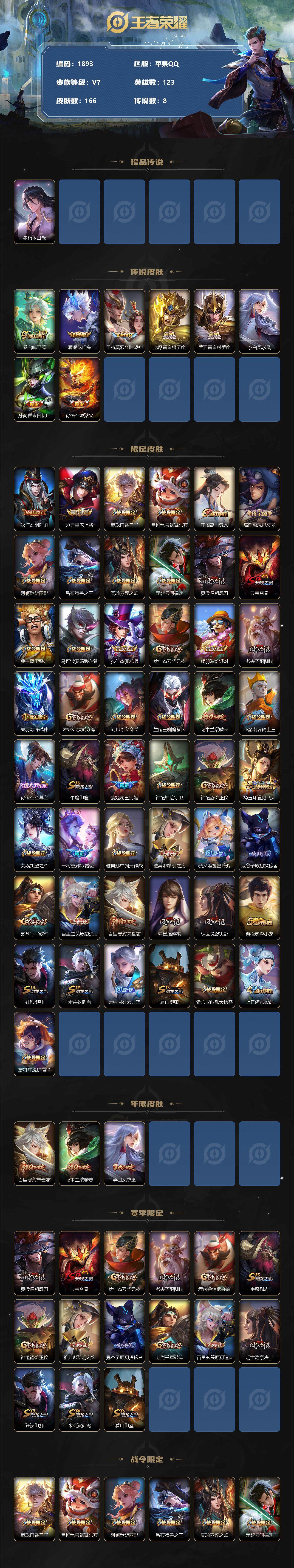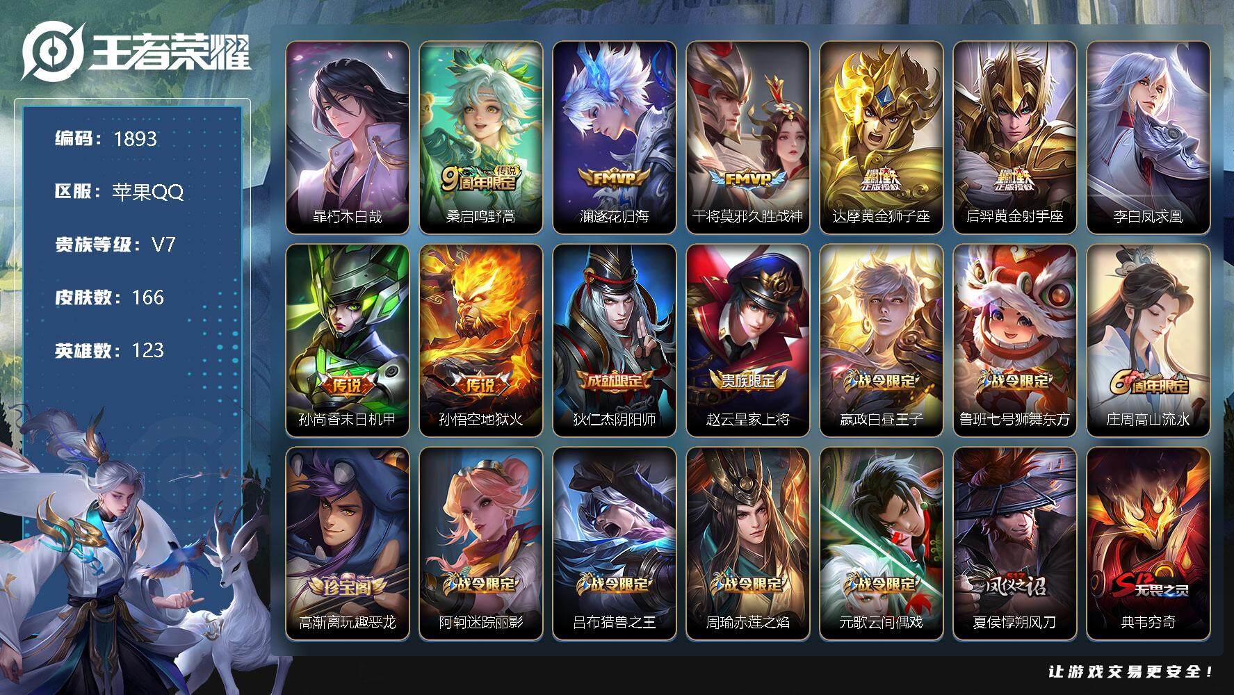 [12456815]【商品标题】:苹果Q-V7-最强王者段位-123英雄-166皮肤-0典藏-0珍品无双-0无双-1珍品传说-8传说-46史诗