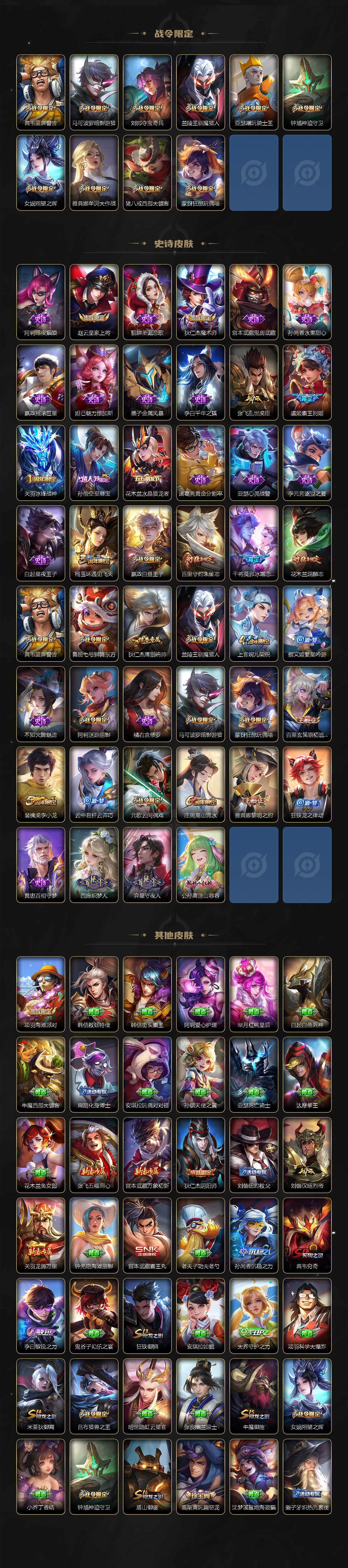 【史诗皮肤】:阿轲暗夜猫娘,赵云皇家上将,貂蝉圣诞恋歌,狄仁杰魔术师,宫本武藏鬼剑武藏,孙尚香水果甜心,嬴政摇滚巨星,妲己魅力维加斯,墨子金属风暴,李白千年之狐,张飞乱世虎臣,虞姬霸王别姬,关羽冰锋战神,孙悟空至尊宝,花木兰水晶猎龙者,诸葛亮黄金分割率,亚瑟心灵战警,李元芳逐浪之夏,白起星夜王子,杨玉环遇见飞天,嬴政白昼王子,百里守约朱雀志,干将莫邪冰霜恋舞曲,花木兰瑞麟志,典韦蓝屏警告,鲁班七号狮舞东方