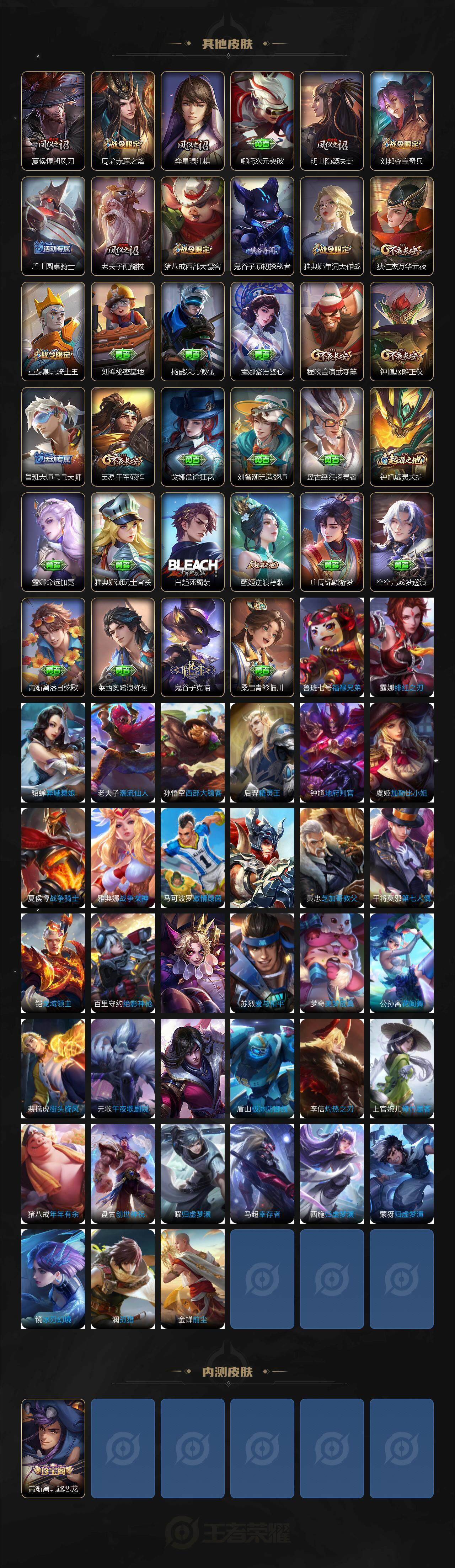 【限定皮肤】:狄仁杰阴阳师,赵云皇家上将,嬴政白昼王子,鲁班七号狮舞东方,庄周高山流水,高渐离玩趣恶龙,阿轲迷踪丽影,吕布猎兽之王,周瑜赤莲之焰,元歌云间偶戏,夏侯惇朔风刀,典韦穷奇,典韦蓝屏警告,马可波罗暗影游猎,狄仁杰魔术师,狄仁杰万华元夜,项羽海滩派对,老夫子醍醐杖,关羽冰锋战神,程咬金演武夺筹,刘邦夺宝奇兵,兰陵王驯魔猎人,花木兰瑞麟志,亚瑟潮玩骑士王,孙悟空至尊宝,牛魔御旌,虞姬霸王别姬,钟馗神迹守卫,钟馗驱傩正仪,杨玉环遇见飞天,女娲朔望之晖,干将莫邪冰霜恋舞曲,雅典娜单词大作战,雅典娜黎明之约,蔡文姬繁星吟游,鬼谷子原初探秘者,苏烈千军破阵,百里玄策原初追逐者,百里守约朱雀志,弈星混沌棋,明世隐疑决卦,裴擒虎李小龙,狂铁御狮,米莱狄御霄,云中君纤云弄巧,盾山御銮,猪八戒西部大镖客,上官婉儿梁祝,蒙犽狂想玩偶喵