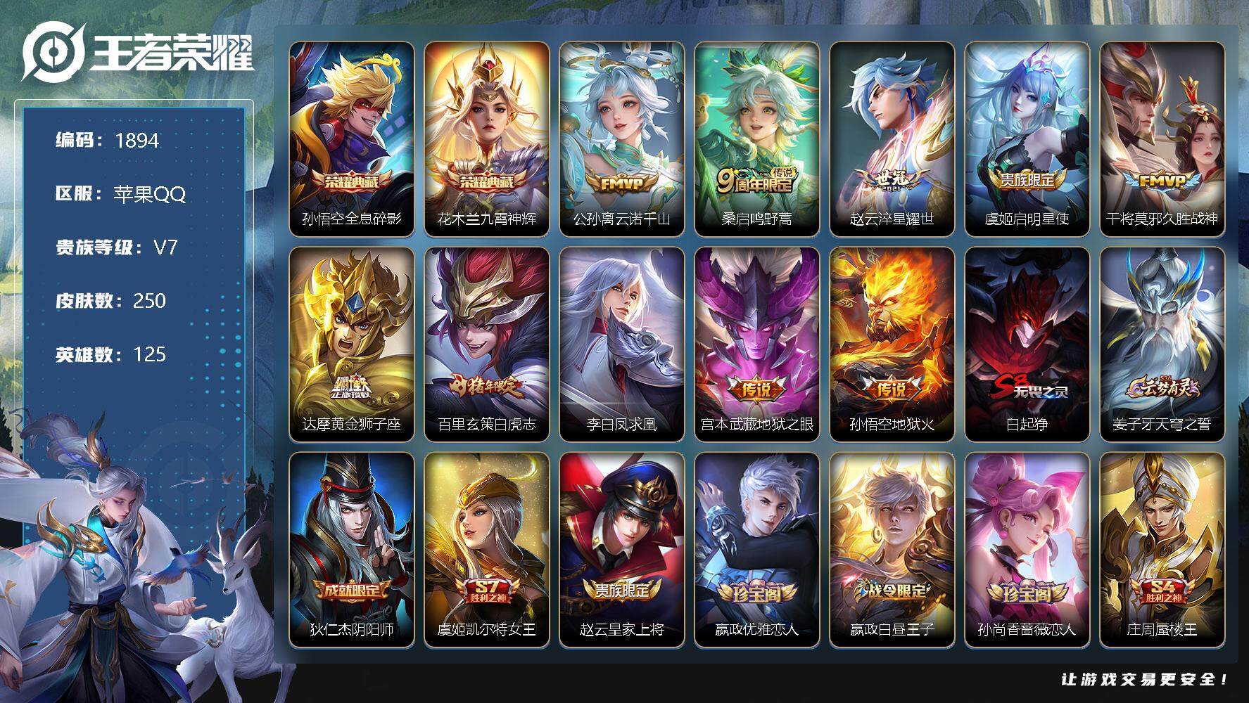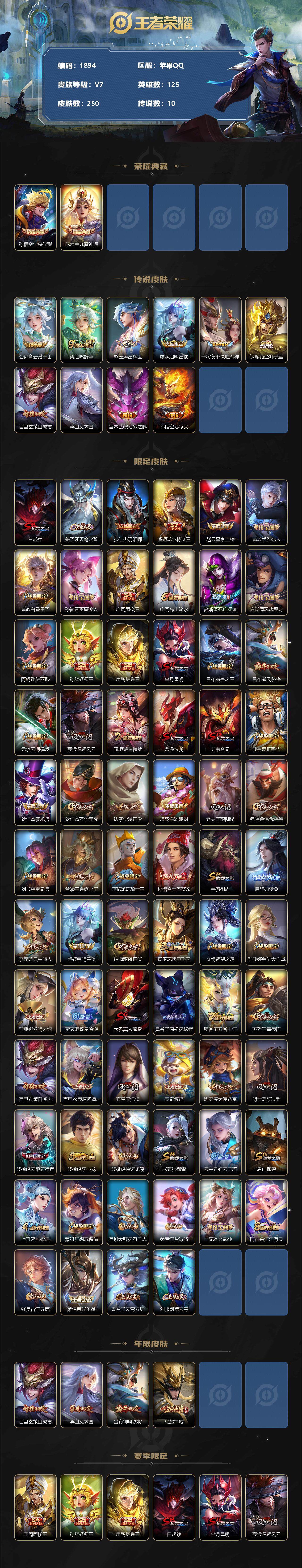 [12456914]【商品标题】:苹果Q-V7-最强王者段位-125英雄-250皮肤-2典藏-0珍品无双-0无双-0珍品传说-10传说-75史诗
