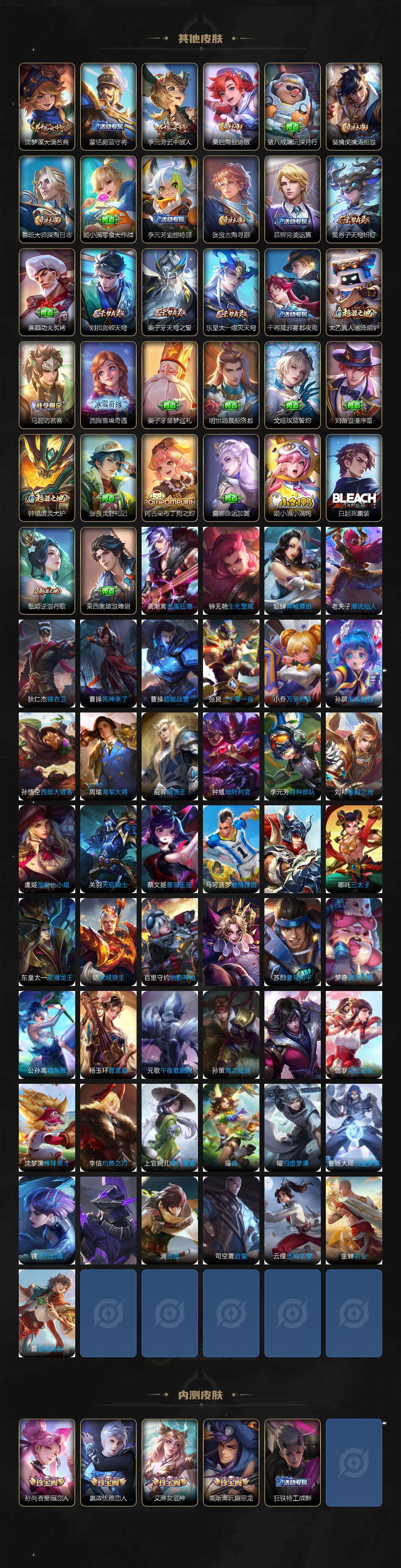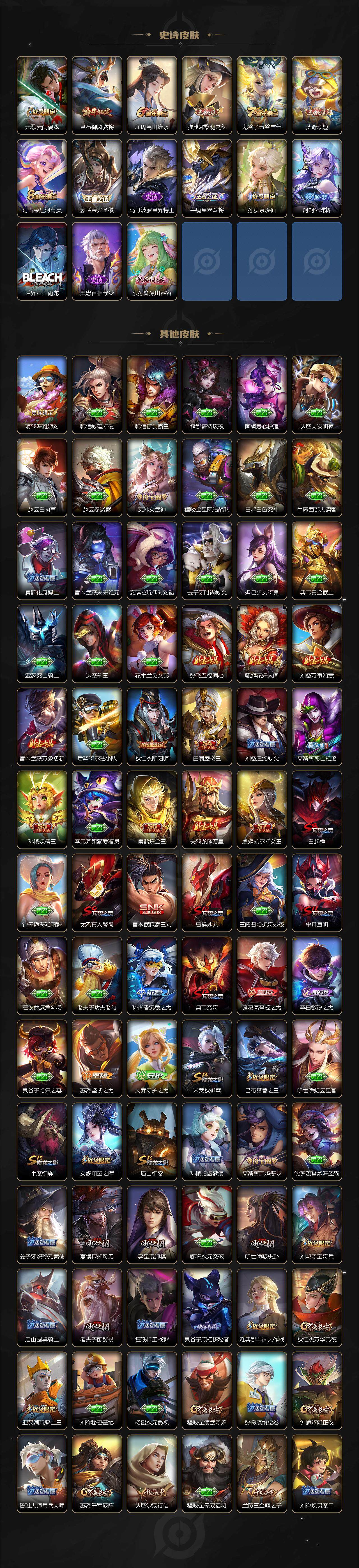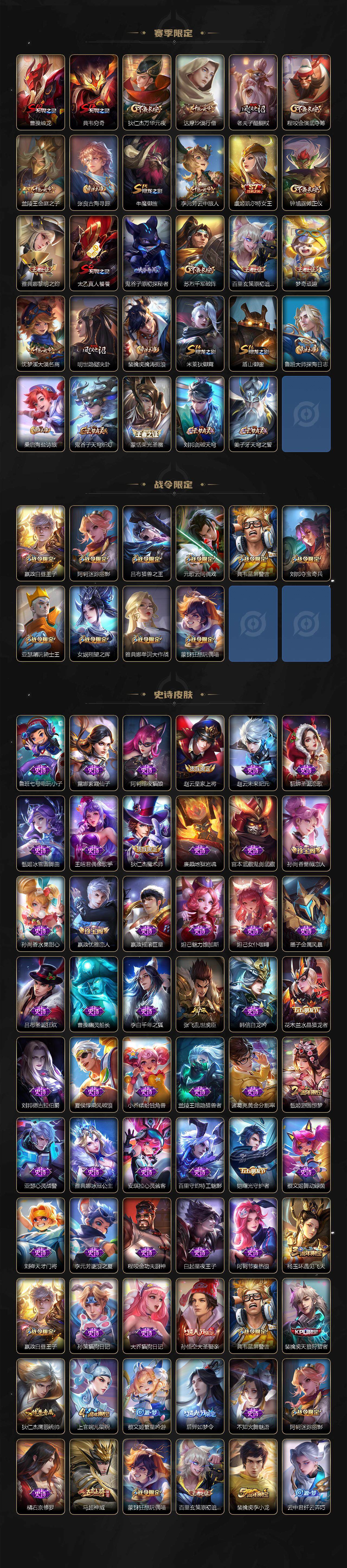【限定皮肤】:白起狰,姜子牙天穹之誓,狄仁杰阴阳师,虞姬凯尔特女王,赵云皇家上将,嬴政优雅恋人,嬴政白昼王子,孙尚香蔷薇恋人,庄周蜃楼王,庄周高山流水,高渐离死亡摇滚,高渐离玩趣恶龙,阿轲迷踪丽影,孙膑妖精王,扁鹊炼金王,芈月重明,吕布猎兽之王,吕布御风骁将,元歌云间偶戏,夏侯惇朔风刀,甄姬游园惊梦,曹操烛龙,典韦穷奇,典韦蓝屏警告,狄仁杰魔术师,狄仁杰万华元夜,达摩沙漠行僧,项羽海滩派对,老夫子醍醐杖,程咬金演武夺筹,刘邦夺宝奇兵,兰陵王金庭之子,亚瑟潮玩骑士王,孙悟空大圣娶亲,牛魔御旌,后羿如梦令,李元芳云中旅人,虞姬启明星使,钟馗驱傩正仪,杨玉环遇见飞天,女娲朔望之晖,雅典娜单词大作战,雅典娜黎明之约,蔡文姬繁星吟游,太乙真人饕餮,鬼谷子原初探秘者,鬼谷子五谷丰年,苏烈千军破阵,百里玄策白虎志,百里玄策原初追逐者,弈星混沌棋,梦奇顽趣,沈梦溪大漠名商,明世隐疑决卦,裴擒虎天狼狩猎者,裴擒虎李小龙,裴擒虎擒涛扼浪,米莱狄御霄,云中君纤云弄巧,盾山御銮,上官婉儿梁祝,蒙犽狂想玩偶喵,鲁班大师探海日志,桑启海盐诗旅,艾琳女武神,阿古朵江河有灵,张良古海寻踪,蒙恬荣光圣徽,鬼谷子天穹祈灯,刘邦剑破天穹