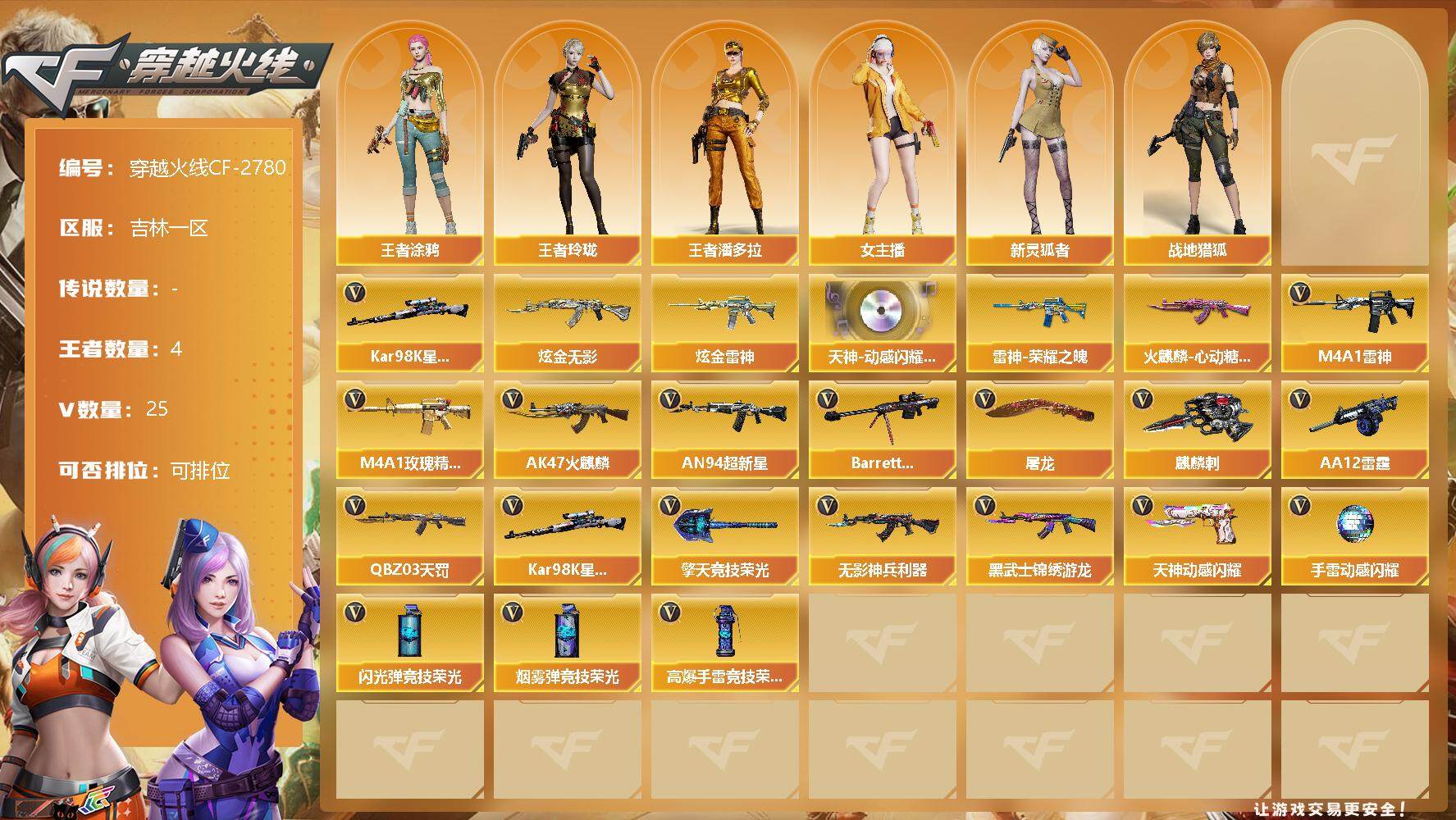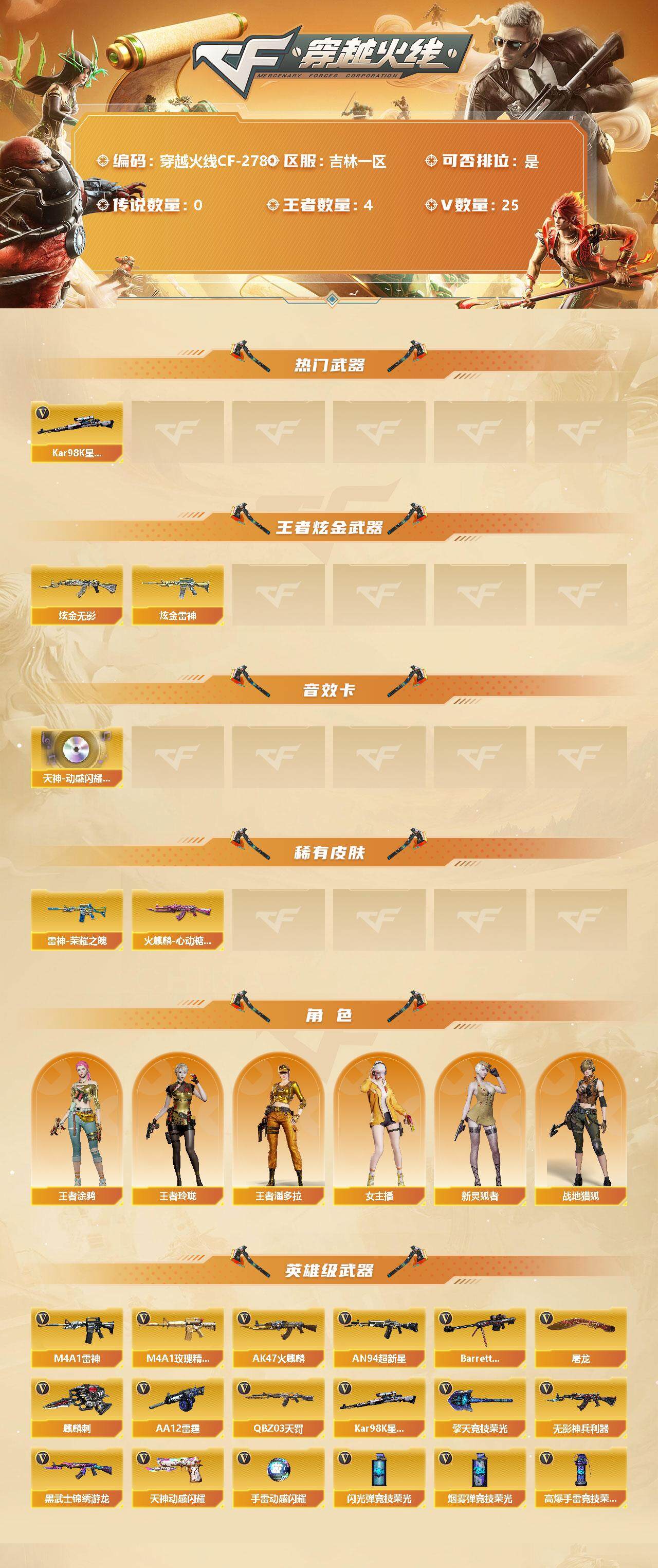 [12456924]【商品标题】:吉林一区-25V-4王者-2炫金 【热门武器】:Kar98K-星神 【王者炫金武器】:炫金无影,炫金雷神 【音效卡】:天神-动感闪耀 音效卡 【稀有皮肤】:雷神-荣耀之魄,火麒麟-心动糖果 【角色】:王者涂鸦,王者玲珑,王者潘多拉,战地猎狐,女主播,新灵狐者 【英雄级武器】:擎天-竞技荣光*2,高爆手雷-竞技荣光,烟雾弹-竞技荣光,闪光弹-竞技荣光*2,天神-动感闪耀,手雷-动感闪耀,无影-神兵利器,M4A1-雷神,M4A1-玫瑰精灵,AK47-火麒麟,AN94-超新星,Barrett-毁灭,AA-12-雷霆,QBZ03-天罚,Kar98K-星神,黑武士-锦绣游龙,麒麟刺,屠龙 【特殊枪械】: