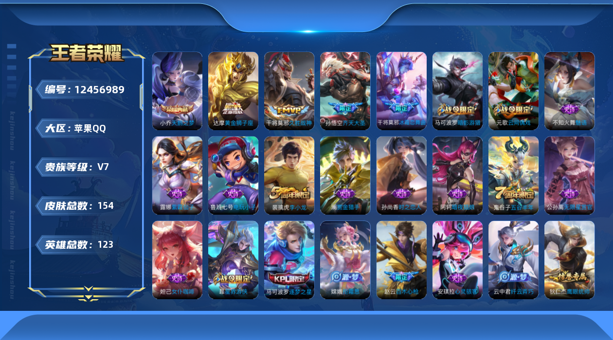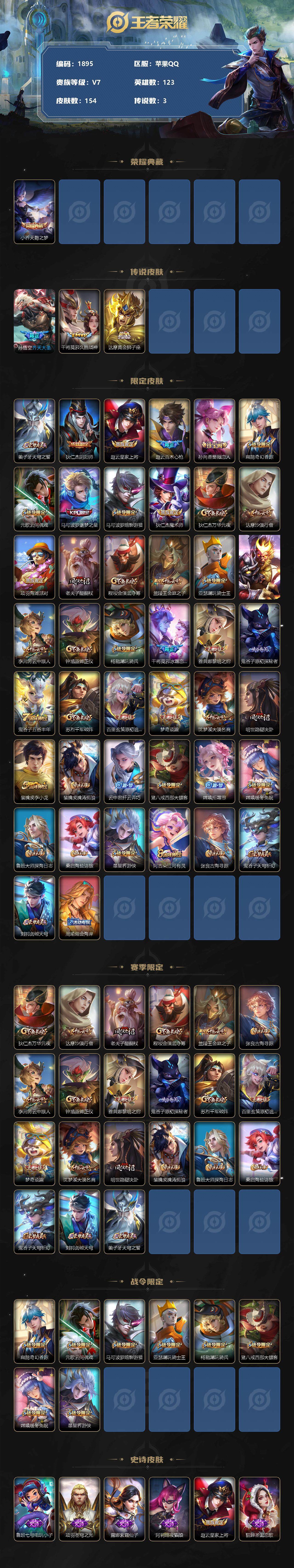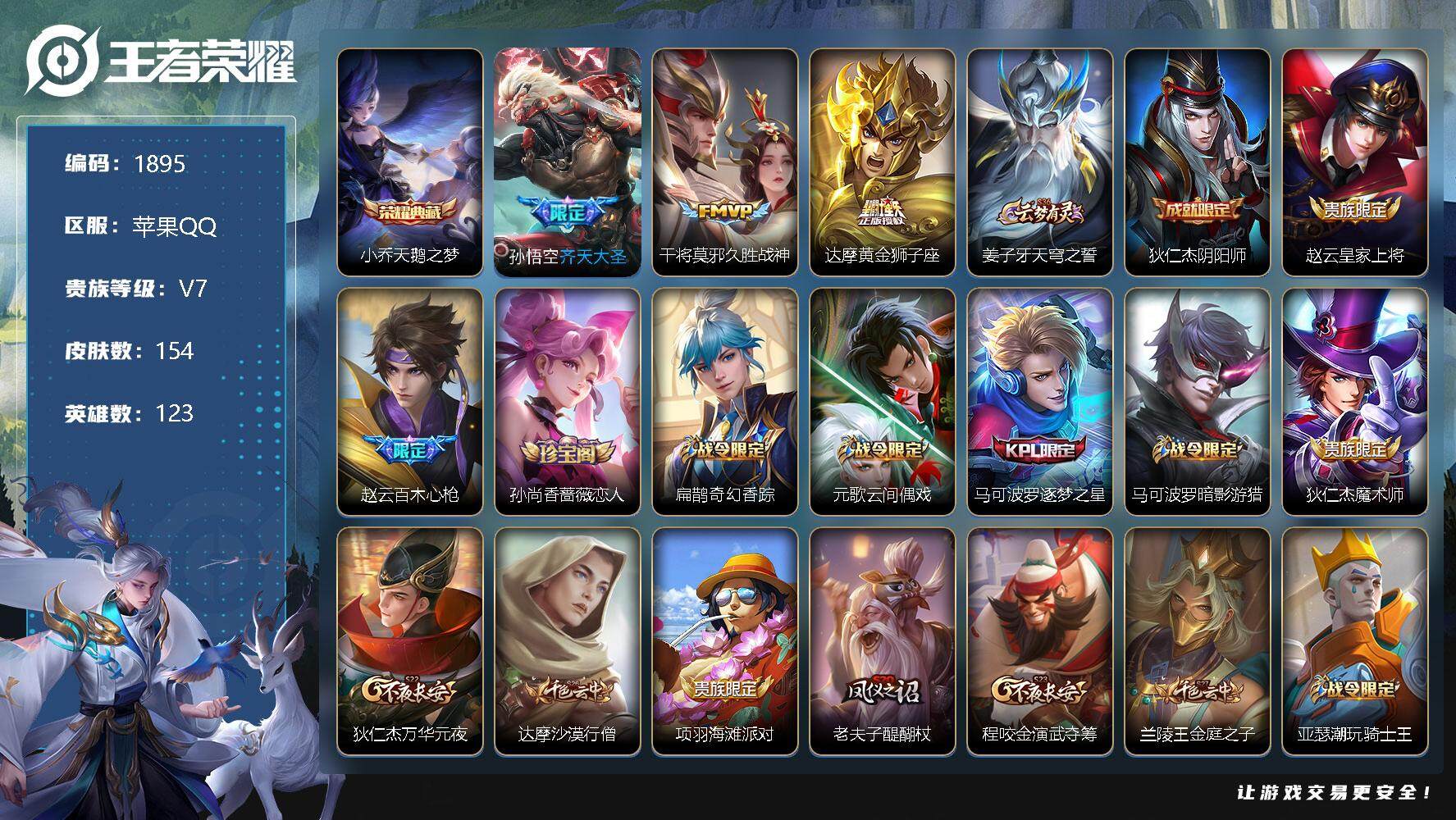 [12456989]【商品标题】:苹果Q-V0-尊贵铂金III段位-123英雄-154皮肤-1典藏-0珍品无双-0无双-0珍品传说-3传说-49史诗