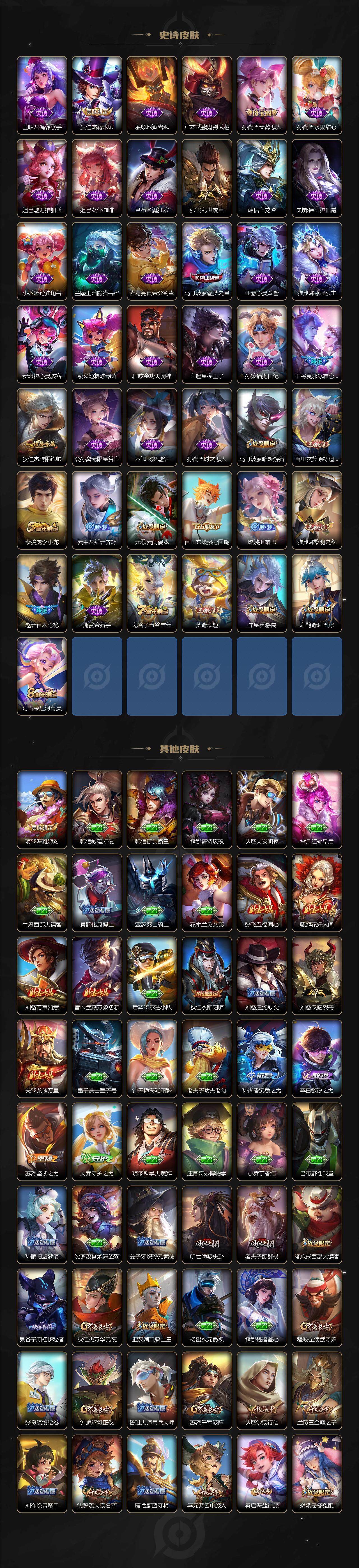 【史诗皮肤】:鲁班七号电玩小子,项羽苍穹之光,露娜紫霞仙子,阿轲暗夜猫娘,赵云皇家上将,貂蝉圣诞恋歌,王昭君偶像歌手,狄仁杰魔术师,廉颇地狱岩魂,宫本武藏鬼剑武藏,孙尚香蔷薇恋人,孙尚香水果甜心,妲己魅力维加斯,妲己女仆咖啡,吕布圣诞狂欢,张飞乱世虎臣,韩信白龙吟,刘邦德古拉伯爵,小乔缤纷独角兽,兰陵王暗隐猎兽者,诸葛亮黄金分割率,马可波罗逐梦之星,亚瑟心灵战警,雅典娜冰冠公主,安琪拉心灵骇客,蔡文姬舞动绿茵,程咬金功夫厨神,白起星夜王子,孙策猫狗日记,干将莫邪冰霜恋舞曲,狄仁杰鹰眼统帅,公孙离无限星赏官,不知火舞魅语,孙尚香时之恋人,马可波罗暗影游猎,百里玄策原初追逐者,裴擒虎李小龙,云中君纤云弄巧,元歌云间偶戏