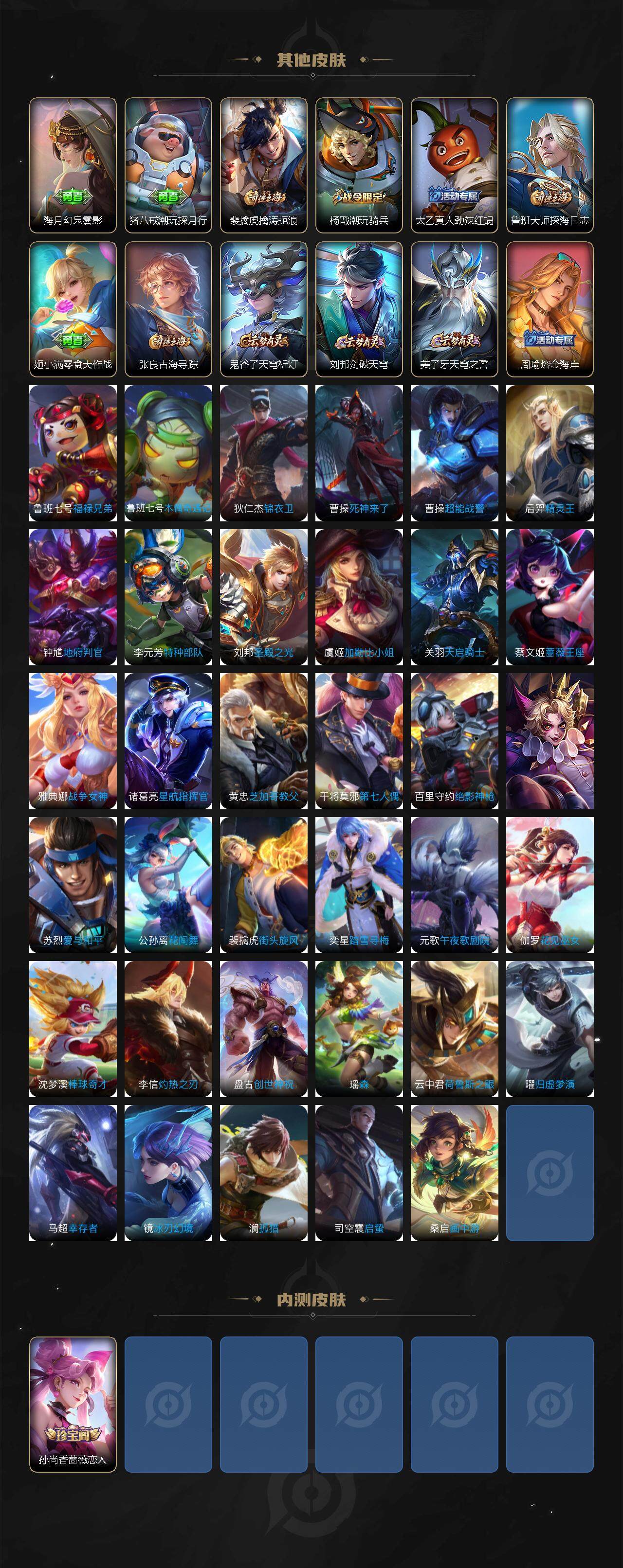 【限定皮肤】:姜子牙天穹之誓,狄仁杰阴阳师,赵云皇家上将,赵云百木心枪,孙尚香蔷薇恋人,扁鹊奇幻香踪,元歌云间偶戏,马可波罗逐梦之星,马可波罗暗影游猎,狄仁杰魔术师,狄仁杰万华元夜,达摩沙漠行僧,项羽海滩派对,老夫子醍醐杖,程咬金演武夺筹,兰陵王金庭之子,亚瑟潮玩骑士王,孙悟空齐天大圣,李元芳云中旅人,钟馗驱傩正仪,杨戬潮玩骑兵,干将莫邪冰霜恋舞曲,雅典娜黎明之约,鬼谷子原初探秘者,鬼谷子五谷丰年,苏烈千军破阵,百里玄策原初追逐者,梦奇顽趣,沈梦溪大漠名商,明世隐疑决卦,裴擒虎李小龙,裴擒虎擒涛扼浪,云中君纤云弄巧,猪八戒西部大镖客,嫦娥拒霜思,嫦娥暖冬兔眠,鲁班大师探海日志,桑启海盐诗旅,暃星界游侠,阿古朵江河有灵,张良古海寻踪,鬼谷子天穹祈灯,刘邦剑破天穹,周瑜熔金海岸