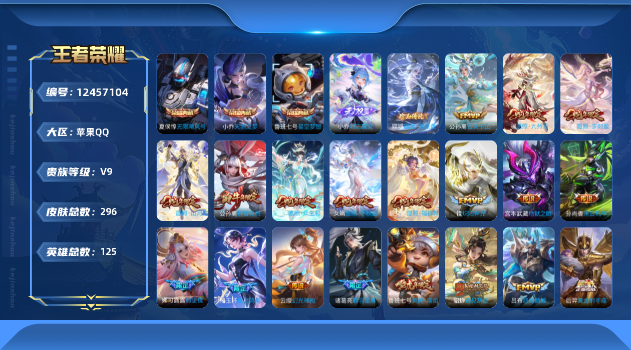[12457104]【商品标题】:苹果Q-V9-最强王者段位-125英雄-296皮肤-3典藏-0珍品无双-1无双-1珍品传说-29传说-98史诗