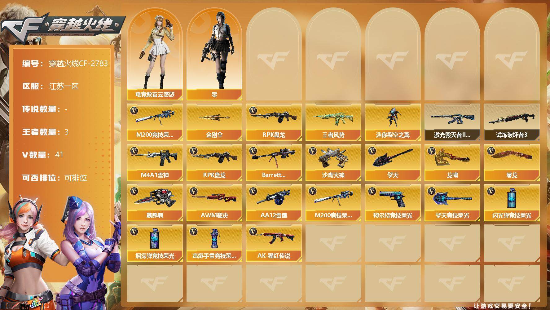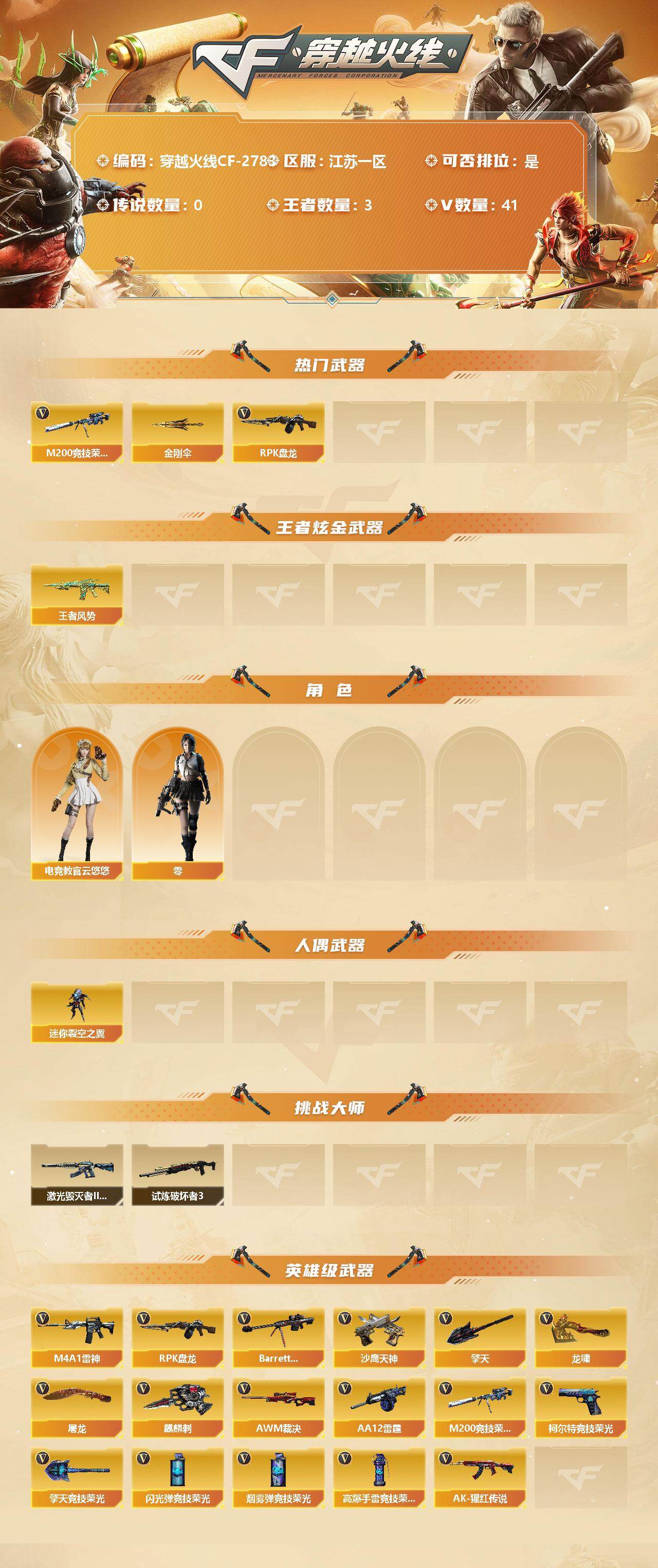 [12457253]【商品标题】:江苏一区-41V-3王者-0炫金 【热门武器】:M200-竞技荣光,RPK-盘龙*3,金刚伞 【王者炫金武器】:王者风势 【角色】:零,电竞教官-云悠悠 【人偶武器】:迷你裂空之翼 【挑战大师】:试炼破坏者III,激光毁灭者III-白马银枪*2 【英雄级武器】:M200-竞技荣光,柯尔特-竞技荣光,擎天-竞技荣光,高爆手雷-竞技荣光*7,烟雾弹-竞技荣光*7,闪光弹-竞技荣光*7,M4A1-雷神,RPK-盘龙*3,Barrett-毁灭,AWM-裁决,AA-12-雷霆,AK-47-猩红传说,沙鹰-天神,麒麟刺,擎天*3,龙啸,屠龙 【特殊枪械】:3盘龙
