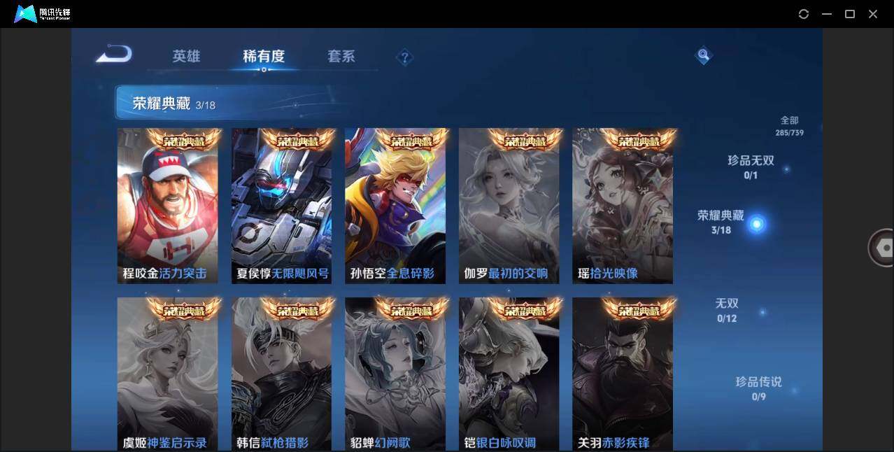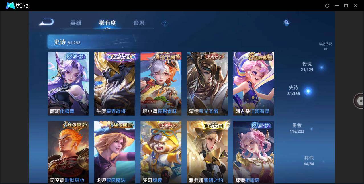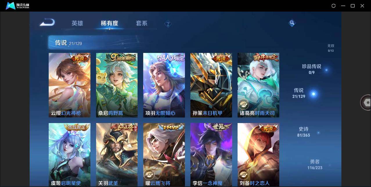 - [11471700]V7 1典藏 15传说 123英雄 169皮肤 可修改实名 优质装备:鸣剑·曳影,云鹰飞将(小将军),炽阳神光,超时空战士-狄仁杰,无双飞将,浮生妄,妄想实况,霜月吟,澜逐花归海 传说皮:乘龙·铭钟鼎(赵云年限),祥瑞亨通,幻光神枪 珍宝阁皮:优雅恋人 限定皮:愿照·九州拓(澜年限),逐霄战戟,鸣野蒿,武陵仙君(小桃花),诗剑行,游园惊梦,匿光追影者 史诗皮:器灵·浮梦炉,绮世丹青,化蝶舞,星界特工,星界战将,龙之律动,茶境仙,破空之剑,东方月初,谪仙醉月,百相守梦-百里守约,紫霞仙子,电玩小子(小书包),特工魅影,千年之狐,百相守梦(刘备),江河有灵,高渐离燃音魔法,蒙恬荣光圣徽,偶像歌手,暗夜猫娘,冰冠公主,末日机甲-吕布,猫狗日记-孙策,猫狗日记-大乔,乱世虎臣,女仆咖啡,水果甜心,星夜王子,心灵骇客,暗隐猎兽者,幽灵船长,鬼剑武藏,心灵战警,天秀·启明,地狱岩魂,乘风破浪,逐浪之夏,水晶猎龙者,曙光守护者,箭羽风息,金属风暴,原初追逐者,鹰眼统帅,魅力维加斯,无心