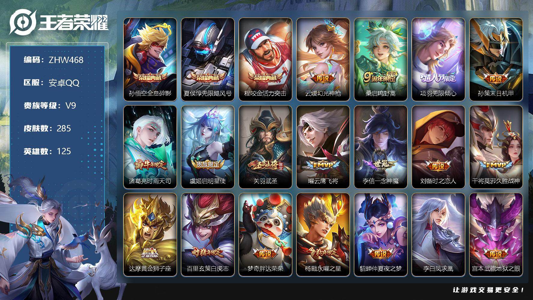 [12457697]【特价急出/详情看图】:安卓Q-V9-至尊星耀IV段位-125英雄-285皮肤-3典藏-21传说-81史诗 【英雄全皮】:空空儿全皮,影全皮 【荣耀典藏】:孙悟空全息碎影,夏侯惇无限飓风号,程咬金活力突击 【传说皮肤】:云缨幻光神枪,桑启鸣野蒿,项羽无限倾心,孙策末日机甲,诸葛亮时雨天司,虞姬启明星使,关羽武圣,曜云鹰飞将,李信一念神魔,刘备时之恋人,干将莫邪久胜战神,达摩黄金狮子座,百里玄策白虎志,梦奇胖达荣荣,杨戬永曜之星,貂蝉仲夏夜之梦,李白凤求凰,宫本武藏地狱之眼,孙悟空地狱火,吕布天魔缭乱,狄仁杰超时空战士 【限定皮肤】:姜子牙天穹之誓,杨戬破阵退雄兵,狄仁杰阴阳师,赵云皇家上将,赵云龙胆,墨子神迹守卫,嬴政白昼王子,鲁班七号狮舞东方,庄周玄嵩,庄周高山流水,高渐离玩趣恶龙,阿轲迷踪丽影,钟无艳王者之锤,吕布天魔缭乱,周瑜赤莲之焰,元歌云间偶戏,夏侯惇朔风刀,曹操天狼征服者,典韦蓝屏警告,典韦岱宗,马可波罗暗影游猎,狄仁杰魔术师,狄仁杰万华元夜,达摩沙漠行僧,项羽海滩派对,项羽无限倾心,老夫子醍醐杖,老夫子航海奇遇记,关羽武圣,程咬金演武夺筹,刘邦夺宝奇兵,韩信飞衡,兰陵王驯魔猎人,亚瑟潮玩骑士王,孙悟空至尊宝,牛魔御旌,后羿如梦令,李元芳银河之约,虞姬启明星使,钟馗神迹守卫,钟馗驱傩正仪,杨玉环遇见飞天,杨戬永曜之星,雅典娜单词大作战,雅典娜黎明之约,鬼谷子原初探秘者,诸葛亮时雨天司,铠青龙志,苏烈千军破阵,百里玄策白虎志,百里玄策原初追逐者,弈星混沌棋,梦奇顽趣,沈梦溪星空之诺,沈梦溪大漠名商,明世隐疑决卦,裴擒虎李小龙,裴擒虎擒涛扼浪,云中君纤云弄巧,盾山御銮,猪八戒西部大镖客,上官婉儿梁祝,嫦娥拒霜思,西施玲珑珍味,蒙犽狂想玩偶喵,鲁班大师探海日志,桑启海盐诗旅,戈娅驭风魔法,艾琳流音漫舞,司空震地狱燃心,阿古朵江河有灵,张良古海寻踪,蒙恬荣光圣徽,鬼谷子天穹祈灯,姬小满妄想食味,沈梦溪龙舞盛年,刘邦剑破天穹,程咬金群星魔术团,周瑜熔金海岸 【年限皮肤】:百里玄策白虎志,铠青龙志,李白凤求凰,杨戬永曜之星,诸葛亮时雨天司,韩信飞衡,典韦岱宗,庄周玄嵩,马超神威,关羽武圣,赵云龙胆 【赛季限定】:夏侯惇朔风刀,狄仁杰万华元夜,达摩沙漠行僧,老夫子醍醐杖,程咬金演武夺筹,张良古海寻踪,牛魔御旌,钟馗驱傩正仪,雅典娜黎明之约,鬼谷子原初探秘者,苏烈千军
