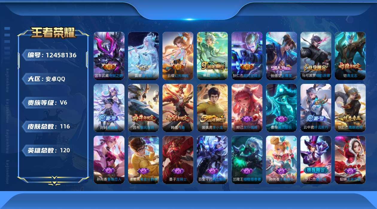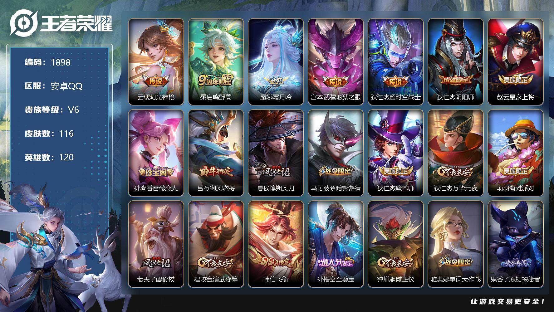 [12458136]【商品标题】:安卓Q-V6-至尊星耀IV段位-120英雄-116皮肤-0典藏-0珍品无双-0无双-0珍品传说-5传说-23史诗