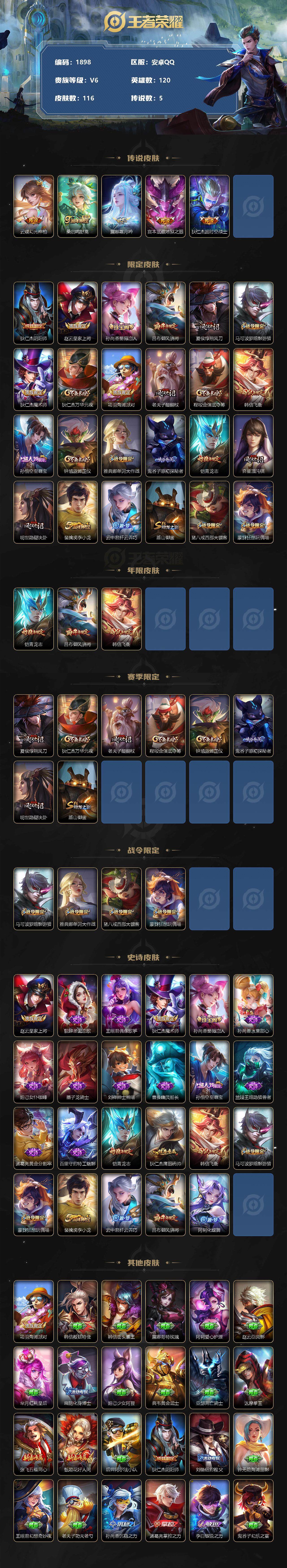 - [12075382]V6 1典藏 4传说 123英雄 180皮肤 可修改实名 优质装备:赤影疾锋,云鹰飞将(小将军) 珍宝阁皮:蔷薇恋人,玩趣恶龙 限定皮:鸣野蒿,遇见飞天,高山流水,齐天大圣,怒海麟威,五谷丰年,梁祝 史诗皮:器灵·浮梦炉,星界战将,龙之律动,百相守梦-周瑜,百相守梦-黄忠,守夜人,紫霞仙子,电玩小子(小书包),黄金分割率,特工魅影,江河有灵,高渐离燃音魔法,蒙恬荣光圣徽,冰冠公主,电玩·爆裂旋风,末日机甲-吕布,猫狗日记-孙策,乱世虎臣,节奏热浪,摇滚巨星,水果甜心,绅士熊喵,暗隐猎兽者,幽灵船长,鬼剑武藏,心灵战警,舞动绿茵,地狱岩魂,乘风破浪,逐浪之夏,水晶猎龙者,曙光守护者,金属风暴,原初追逐者,圣诞狂欢,圣诞恋歌,鹰眼统帅,魅力维加斯,无心,未来纪元-赵云