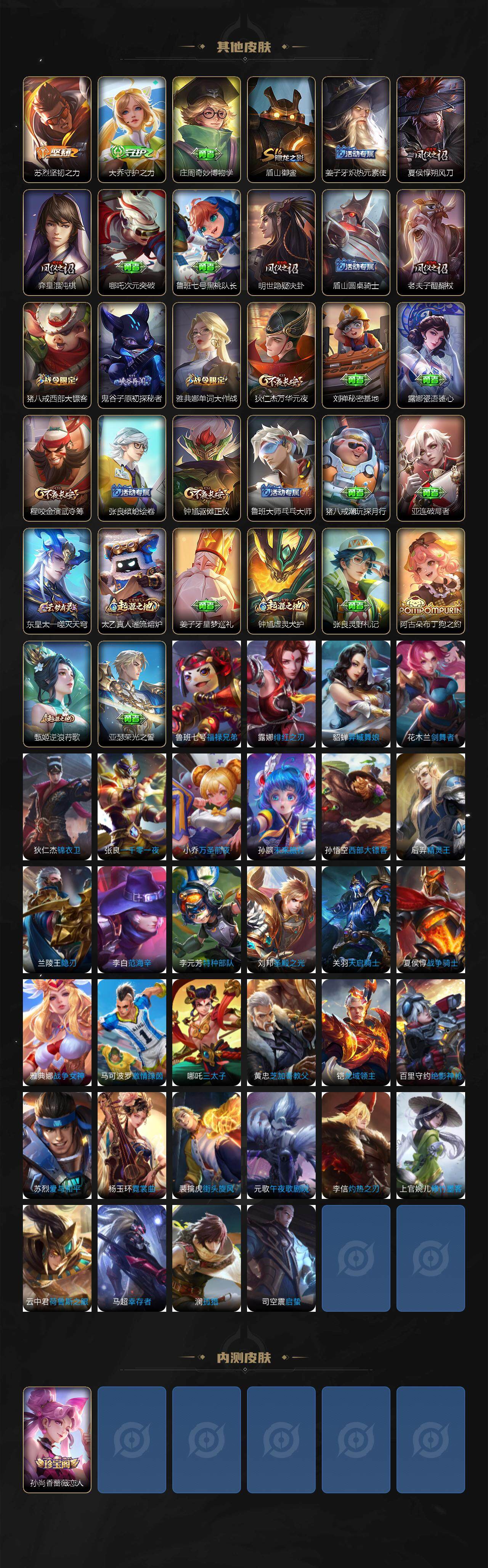 【其他皮肤】:项羽海滩派对,韩信教廷特使,韩信街头霸王,露娜哥特玫瑰,阿轲爱心护理,赵云忍炎影,芈月红桃皇后,扁鹊化身博士,妲己少女阿狸,典韦黄金武士,亚瑟死亡骑士,达摩拳王,张飞五福同心,甄姬花好人间,后羿阿尔法小队,狄仁杰阴阳师,刘备纽约教父,钟无艳海滩丽影,王昭君幻想奇妙夜,老夫子功夫老勺,孙尚香沉稳之力,诸葛亮掌控之力,李白敏锐之力,鬼谷子幻乐之宴,苏烈坚韧之力,大乔守护之力,庄周奇妙博物学,盾山御銮,姜子牙炽热元素使,夏侯惇朔风刀,弈星混沌棋,哪吒次元突破,鲁班七号黑桃队长,明世隐疑决卦,盾山圆桌骑士,老夫子醍醐杖,猪八戒西部大镖客,鬼谷子原初探秘者,雅典娜单词大作战,狄仁杰万华元夜,刘禅秘密基地,露娜瓷语鉴心,程咬金演武夺筹,张良缤纷绘卷,钟馗驱傩正仪,鲁班大师乓乓大师,猪八戒潮玩探月行,亚连破局者,东皇太一噬灭天穹,太乙真人谧流熔炉,姜子牙星梦巡礼,钟馗虚灵犬护,张良灵