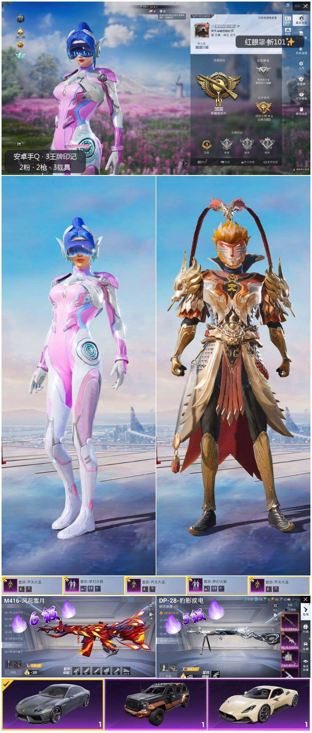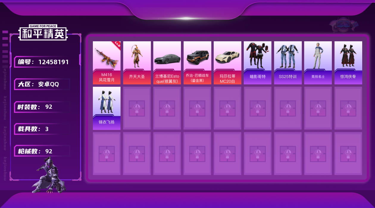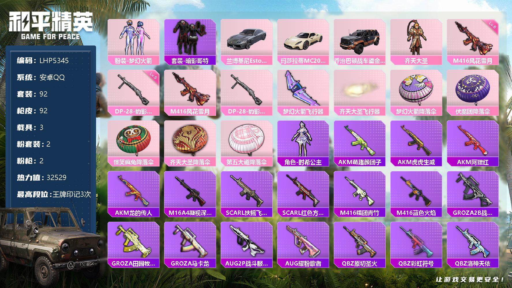 [12458191]【特价急出/详情看图】:安卓 手Q-2粉装-2特效枪-3载具-2粉色飞行器-3.2w热力值-3王牌印记-92套装-92枪皮【热门品类】:粉装-梦幻火箭,套装-暗影哥特【粉色载具】:兰博基尼Estoque(银翼灰),玛莎拉蒂MC20(星石白),乔治巴顿战车(鎏金黑)【粉色套装】:粉装-梦幻火箭,粉装-齐天大圣【粉色枪皮等级】:M416-风花雪月(六级),DP-28-豹影疾电(五级)【粉色飞行器】:梦幻火箭飞行器,齐天大圣飞行器