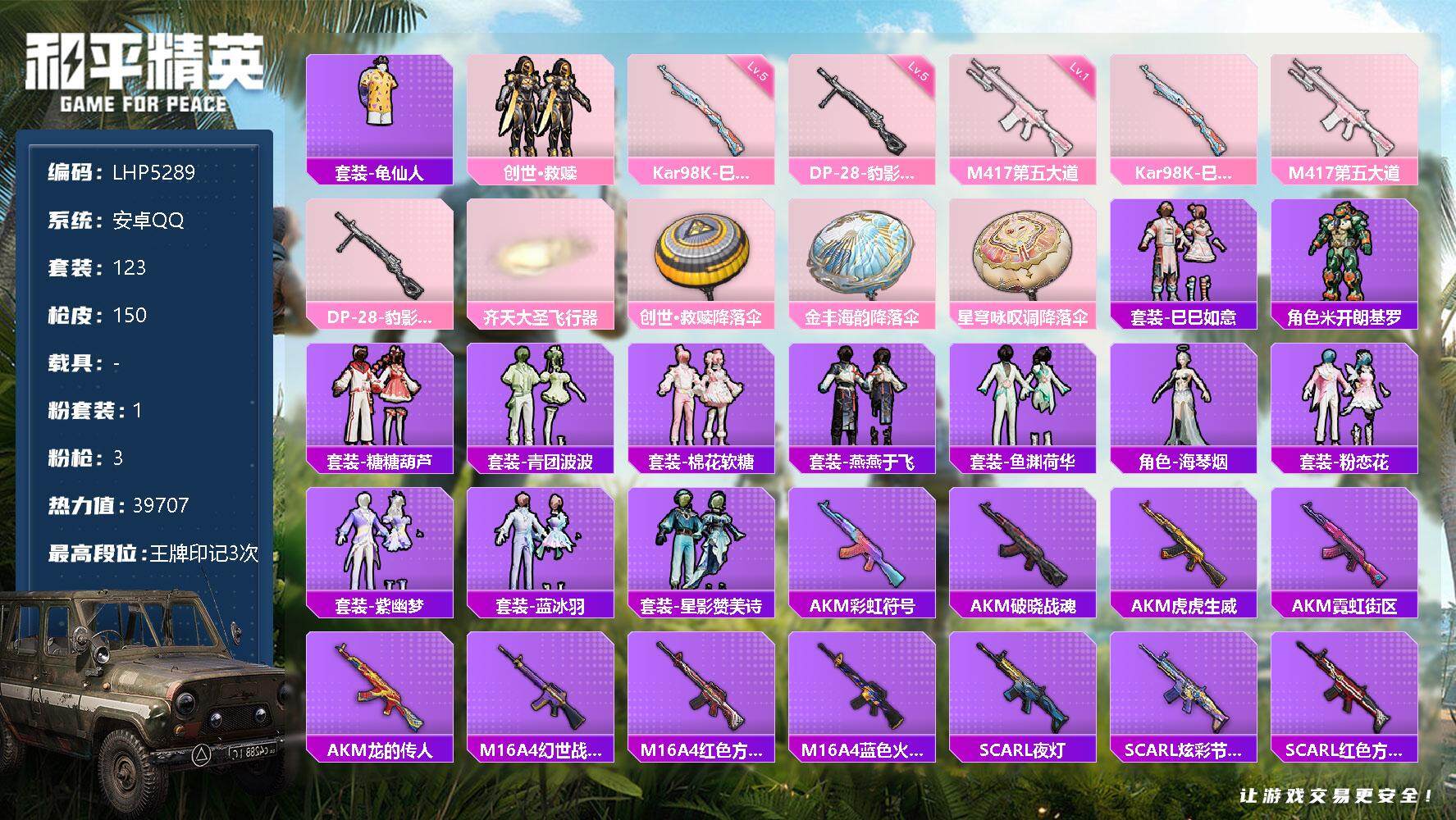 [12458197]地铁满天赋【特价急出/详情看图】:安卓 手Q-1粉装-3特效枪-1粉色飞行器-3.9w热力值-3王牌印记-123套装-150枪皮【热门品类】:套装-龟仙人【粉色套装】:套装-创世·救赎【粉色枪皮等级】:Kar98K-巳巳如意(五级),M417-第五大道(一级),DP-28-豹影疾电(五级)【粉色飞行器】:齐天大圣飞行器