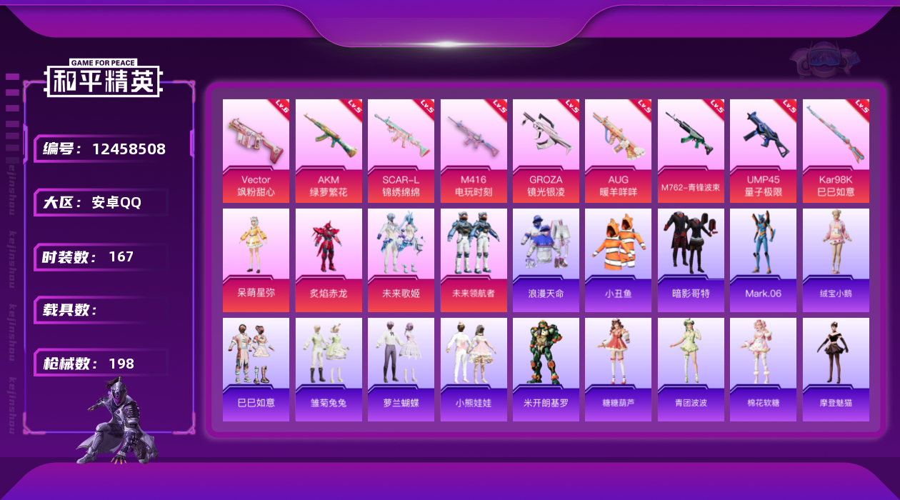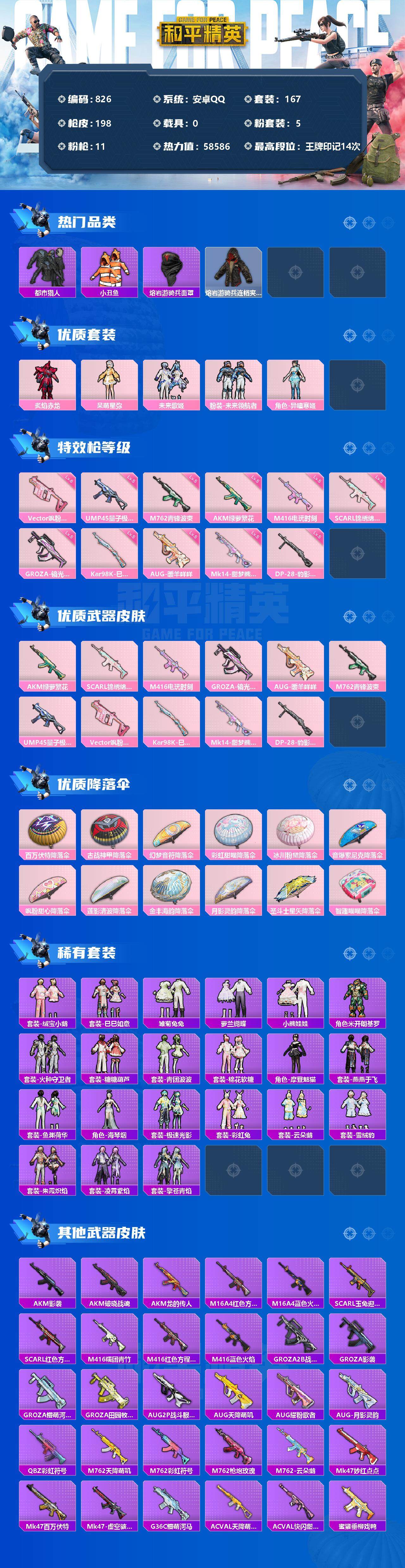 [12458508]【商品标题】:安卓 手Q-5粉装-11特效枪-0载具-0粉色飞行器-58586热力值-14王牌印记-167套装-198枪皮