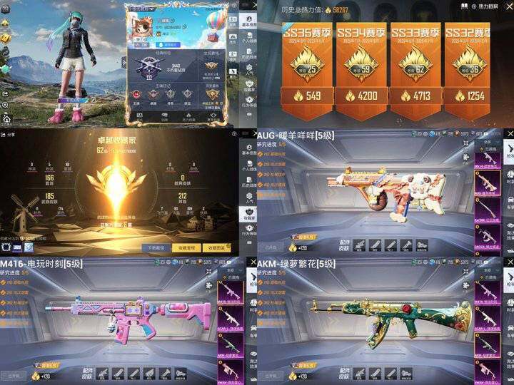 AKM-绿萝繁花,M416-电玩时刻,GROZA-镜光银凌,AUG-暖羊咩咩,M762-青锋波束,UMP45-量子极限,Vector-飒粉甜心,Kar98K-巳巳如意