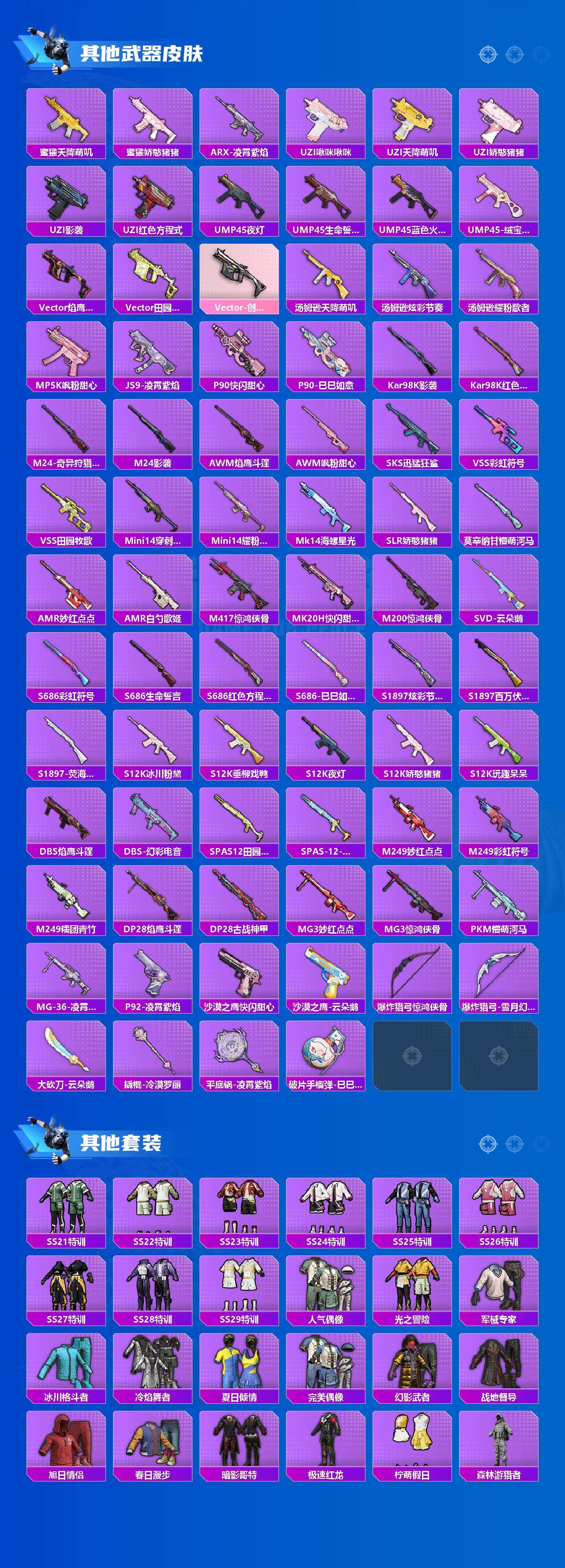 - [12025173]4粉装 6特效枪 2载具 11印记 可二次 可修改实名 身法装备:8号机(新粉螳螂) 优质装备:特斯拉Roadster(水滴蓝),M416心之恋语,Groza香水柠檬,银刃赛罗,俏皮狐尾,七级GROZA-香水柠檬,七级M416-心之恋语,UMP45量子极限,AUG-暖羊咩咩,Kar98K-巳巳如意 热门装扮:蓝莓炮弹,金丰海韵,好奇恐龙 载具:空客H135-蔚蓝之翼,萌喵橘座 稀有枪皮:DP-28-豹影疾电 五级特效枪:五级UMP45-量子极限,五级Kar98K-巳巳如意,五级DP-28-豹影疾电,五级AUG-暖羊咩咩 紫色装扮:SS22特训,SS23特训,娇憨猪猪,酸甜橘柚,暖心橘喵,萌趣咩咩,SS21特训,SS31特训套装,SS2特训,SS3特训,SS5特训,人气偶像,军械专家,冰原使者,,冷焰舞者,凛冬战士,刚毅裁决者,北国孤狼,千禧之恋,SS30特训套装,SS33特训套装,青涩时光,SS20特训,青春冒险家,潮流游乐家,SS15特训,暗夜傀儡,时空追击者,暴风机械师,SS16特训,爆裂葡萄,快乐星愿,遗落祭司,冰爽海盐,银白舞王,SS13特训,骁骑迪迦,诡谋托雷基亚,浪漫樱花,治愈之星,迅捷之星,科技之星,SS14特训,萌趣颜团子,特种颜团子,飞驰魅影,音速流光,SS19特训,吉莉礼服,雪兔飞飞,瑞龙福将,团圆交子,醒狮腾龙,SS17特训,炫光向阳,异彩先驱,缤纷焰火,SS18特训,都市魅力,酒红色名流,酷潮明星,野性战心,长空猛禽,雪山征服者,雪山精英,霓虹极客,霓虹街区,青年教官,迎春赐吉,缤纷果语,荣耀,蓝彩潮人,蓝色运动,虎虎生威吉莉,街头潮人,飞行日记,龙腾端午,骑行爱好者,魅力单车,鹤鸣,麻辣教官,黄色伏地魔,黄色名流,黄色运动,黎明保卫者,黑色伏地魔,龙的传人,龟仙人,冰河战士,龙魂突击队,蝶变,香桃花海,熔岩游骑兵连帽夹克,极速红龙,柠萌假日,格斗先锋,橘黑制服,沙漠兵团,海滨突袭者,深蓝色名流,滨海假日,幻影武者,圣诞大吉,坚韧舞者,夏日音浪,夜莺强袭者,完美偶像,帅气教官,幻世战舞者,怒火燎原,战地督导,战地菁英,探宝勇士,湖蓝色名流,滨海厨神,绮丽涂鸦,疯狂小兔子,白色伏地魔,破晓战魂,破蛋小黄鸡,神秘领域,甜蜜告白,福星高照,空岛之星,空投萌叽,竞技勇士朋克,竞技达人朋克,红色运动,甜蜜熊情侣,王牌教练,牛气冲天,灰色格斗者,灼焰舞