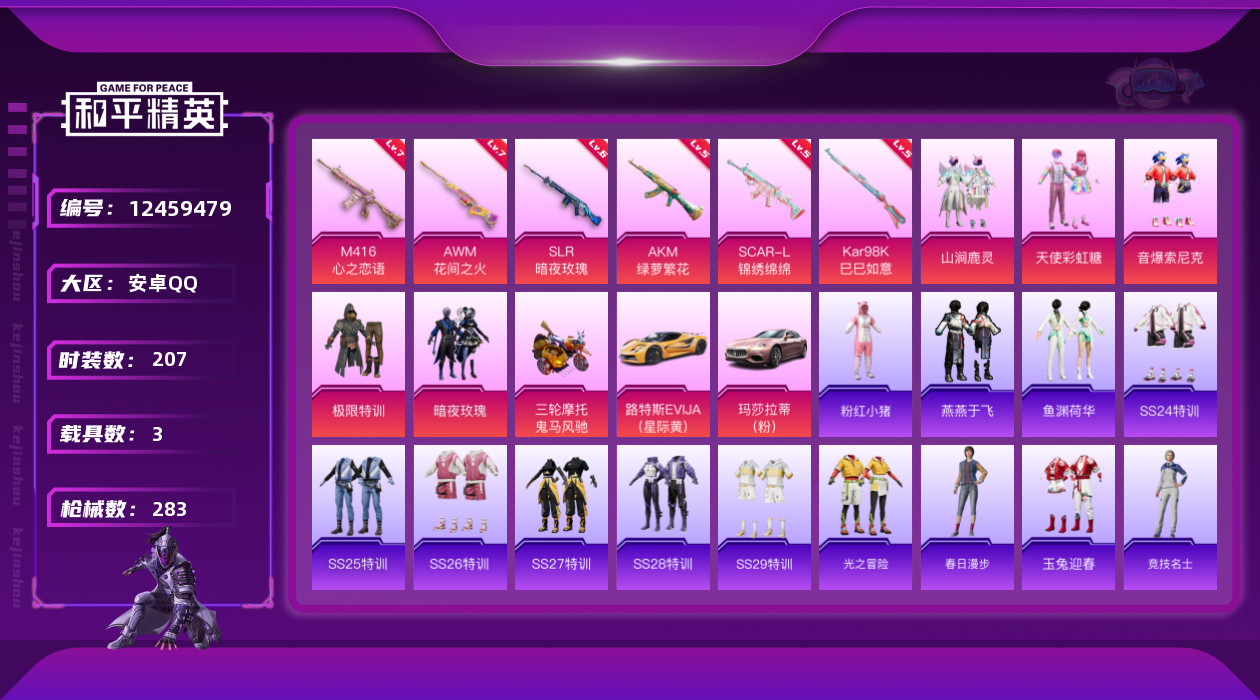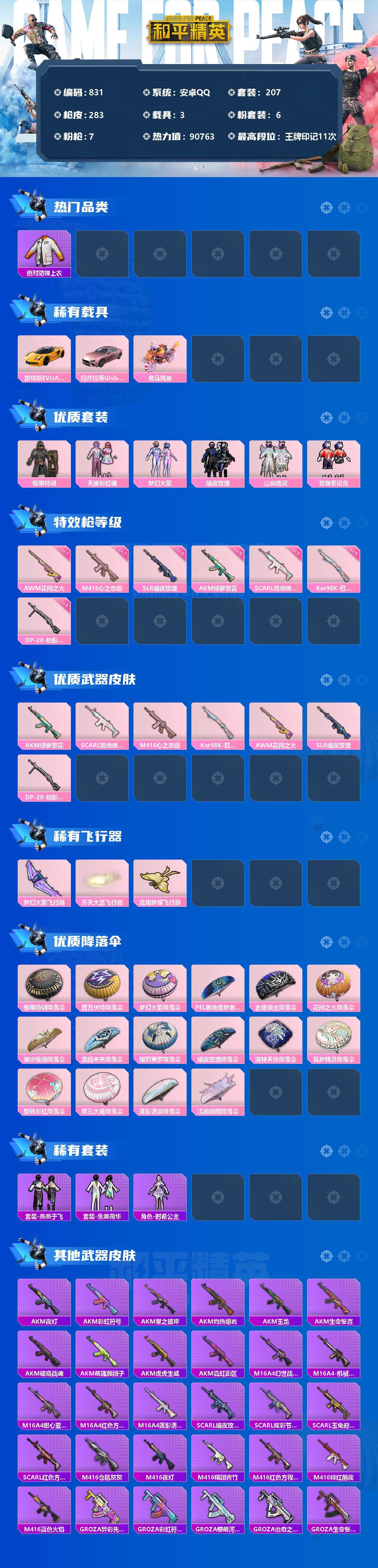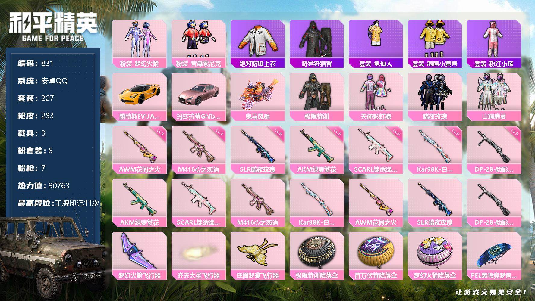 [12459479]【商品标题】:安卓 手Q-6粉装-7特效枪-3载具-3粉色飞行器-90763热力值-11王牌印记-207套装-283枪皮