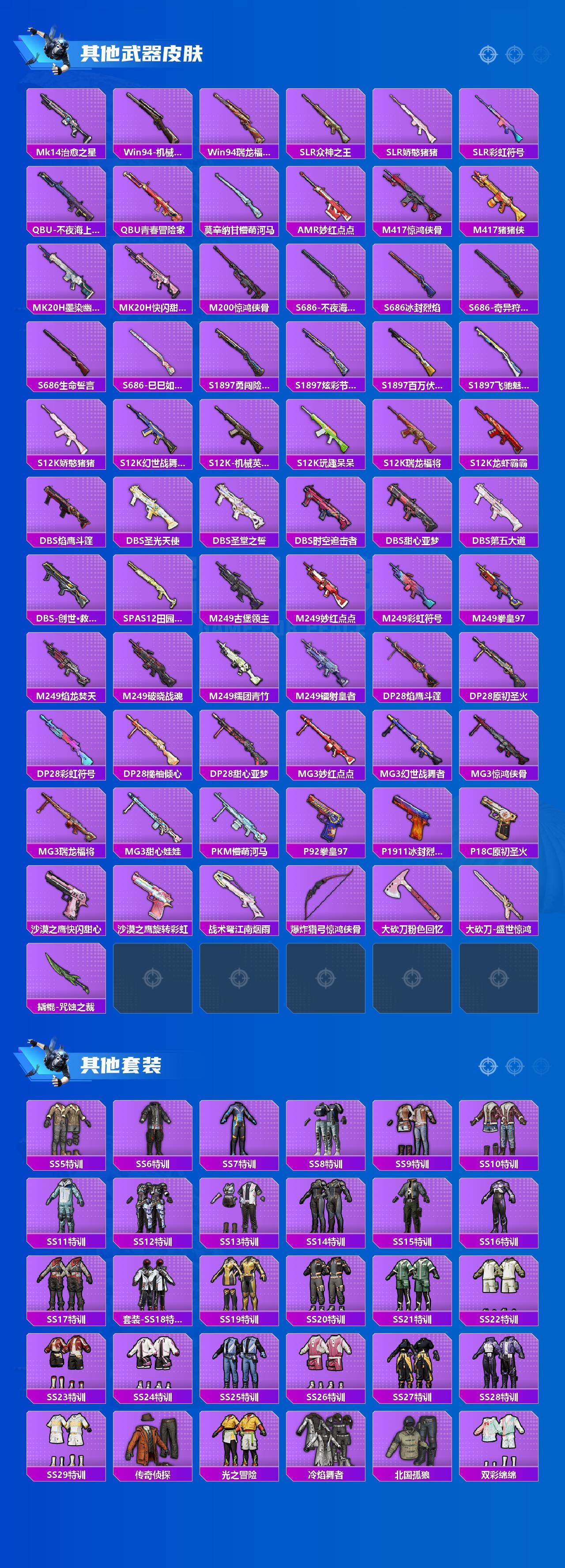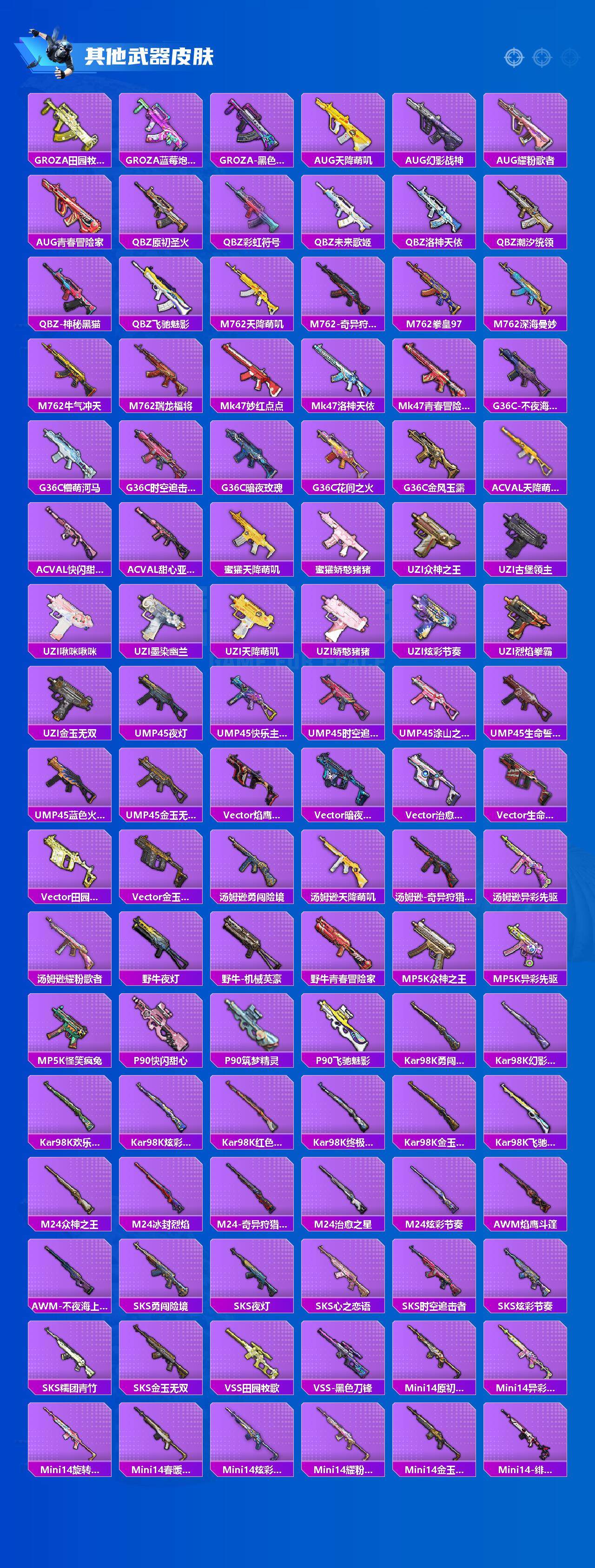 【稀有枪皮】:AKM-夜灯,AKM-彩虹符号,AKM-星之彼岸,AKM-灼热熔岩,AKM-玉龙,AKM-生命誓言,AKM-破晓战魂,AKM-萌趣颜团子,AKM-虎虎生威,AKM-霓虹街区,M16A4-幻世战舞者,M16A4-机械英豪,M16A4-甜心亚梦,M16A4-红色方程式,M16A4-莲影清波,SCAR-L-暗夜玫瑰,SCAR-L-炫彩节奏,SCAR-L-玉兔迎春,SCAR-L-红色方程式,M416-仓鼠灰灰,M416-夜灯,M416-糯团青竹,M416-红色方程式,M416-绯红前夜,M416-蓝色火焰,GROZA-异彩先驱,GROZA-彩虹符号,GROZA-懵萌河马,GROZA-治愈之星,GROZA-生命誓言,GROZA-田园牧歌,GROZA-蓝莓炮弹,GROZA-黑色刀锋,AUG-天降萌叽,AUG-幻影战神,AUG-耀粉歌者,AUG-青