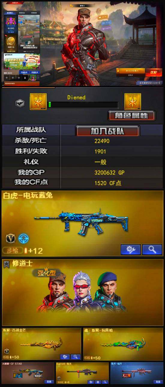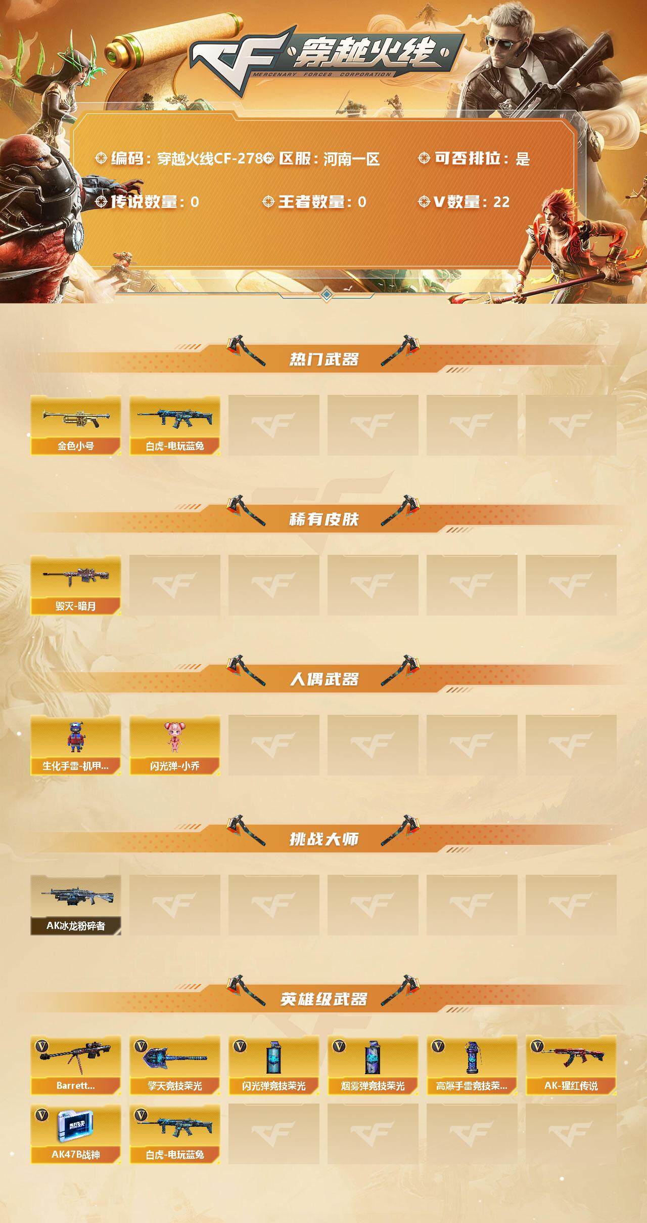 [12459477]【商品标题】:河南一区-22V-0王者-0炫金 【热门武器】:白虎-电玩蓝兔,金色小号 【稀有皮肤】:毁灭-暗月 【人偶武器】:生化手雷-机甲核心,闪光弹-小乔 【挑战大师】:AK47-冰龙粉碎者 【英雄级武器】:擎天-竞技荣光,高爆手雷-竞技荣光,烟雾弹-竞技荣光*2,闪光弹-竞技荣光*2,白虎-电玩蓝兔,Barrett-毁灭,AK-47-猩红传说*6,AK47-B-战神 【特殊枪械】: