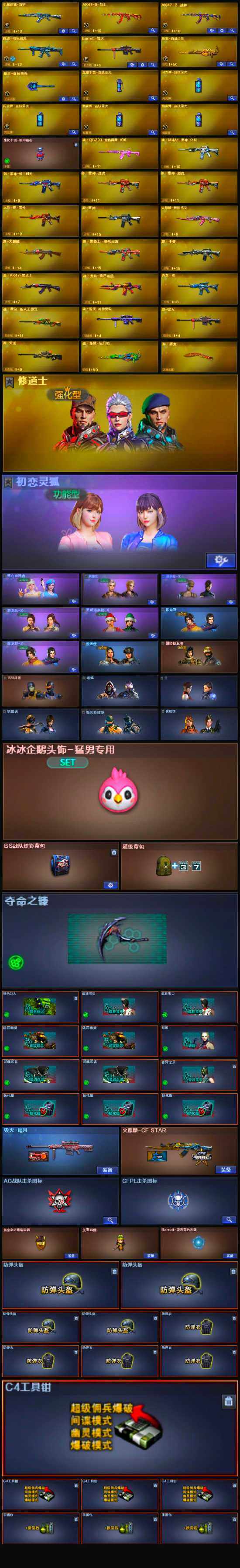 【英雄级武器】:擎天-竞技荣光,高爆手雷-竞技荣光,烟雾弹-竞技荣光*2,闪光弹-竞技荣光*2,白虎-电玩蓝兔,Barrett-毁灭,AK-47-猩红传说*6,AK47-B-战神