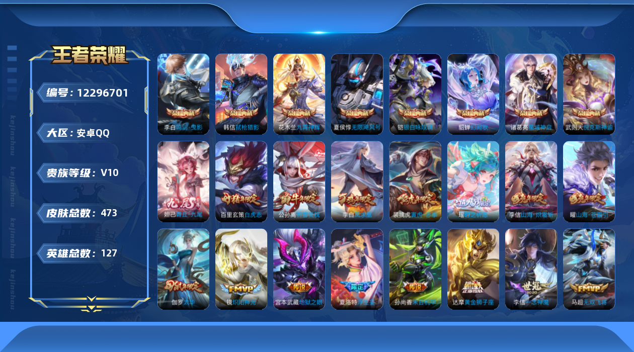 [12296701]V10 127英雄 437皮肤 8荣耀典藏 1无双 63传说 160史诗 可修改实名 营地封10年 优质装备:倪克斯神谕(宇宙婆娘),无限飓风号(高达),鸣剑·曳影,星域神启(倪克斯贼亮),九霄神辉(木兰典藏),银白咏叹调(倪克斯侍卫),幻阙歌(貂蝉典藏),弑枪猎影(韩信典藏),青丘·九尾(妲己无双),黄金狮子座,黄金射手座,冠军飞将,云鹰飞将(小将军),绛天战甲(鸡嘴战神),久胜战神,炽阳神光,一念神魔,云霓雀翎,末日机甲-孙尚香(绿蚂蚱),地狱火,仲夏夜之梦(大飞蛾),音你心动-小乔,零号·赤焰,海洋之心,地狱之眼,胖达荣荣,乞巧织情,淬星耀世,遇见胡旋,末日机甲-孙策,挚爱之约,挚爱花嫁,无双飞将,碎云,神器·狴犴令,山海·炽霜斩(李信年限),山海·琳琅生(小乔年限),山海·苍雷引(电光曜子),炽翼辉光(娃娃菜牛角包),燃星之曲,画中仙,浮生妄,记忆之芯(机甲兔),百相守梦(张飞),追逃游戏(亚瑟),追逃游戏(安琪拉),电玩·雷克斯,鹤羽星尊,灼幽烈阳,妄想实况,妄想奇谈,艾琳觅芳踪 限定皮:白虎志(电光耗子),凤求凰(白切鸡),太华(伽罗年限),武陵仙君(小桃花),异界灵契(白毛香),星穹之声,绯月行,时雨天司(水龙头),无限倾心-项羽,诗剑行,无限倾心-虞姬,齐天大圣,怒海麟威,祈雪灵祝(雪兔子),默契交锋-兰陵王,寅虎·瑞焰(虎皮蛋子),寅虎·赤拳(老虎年限),时之祈愿-瑶(瑶传限),启示之音