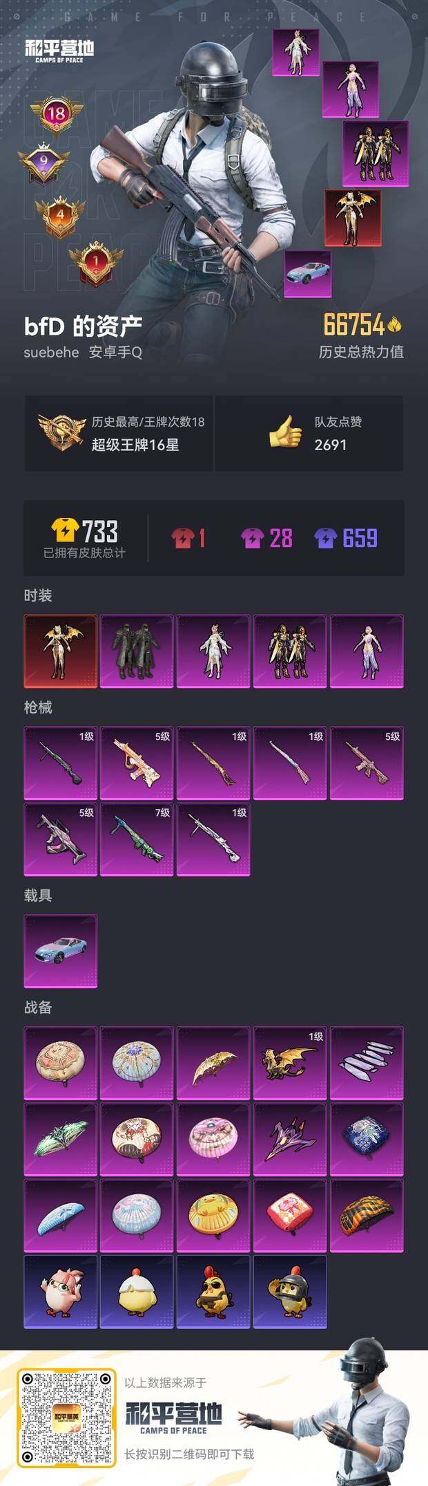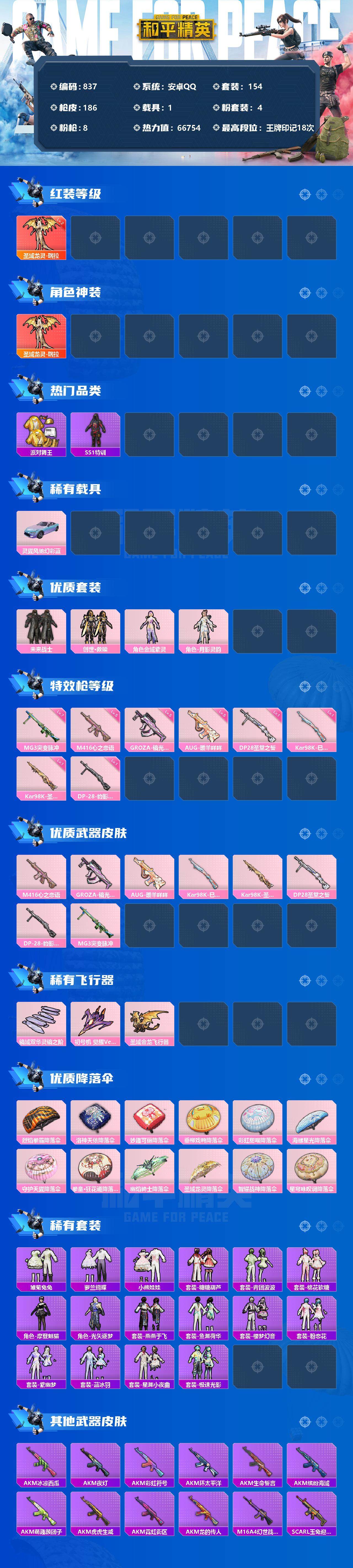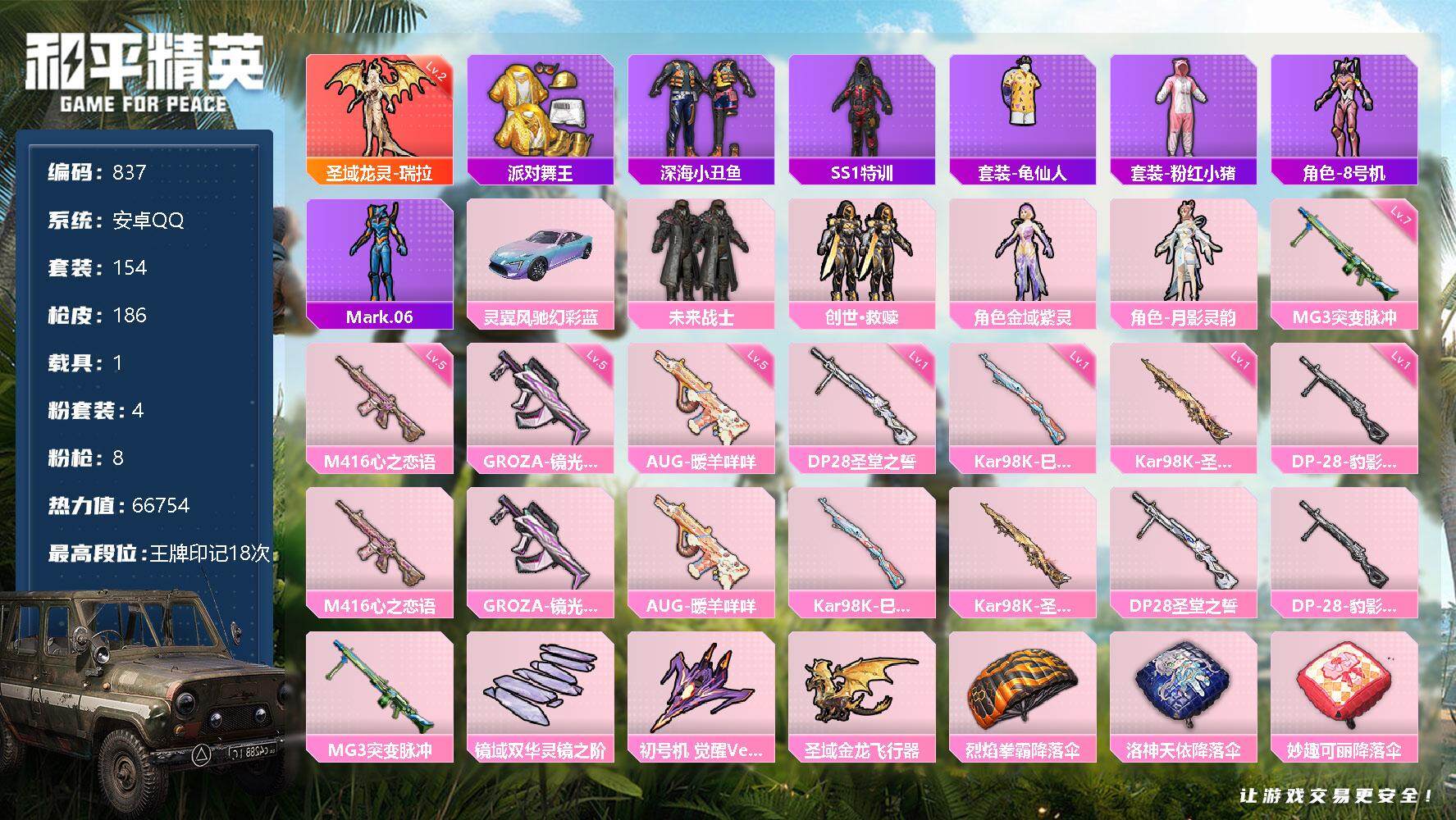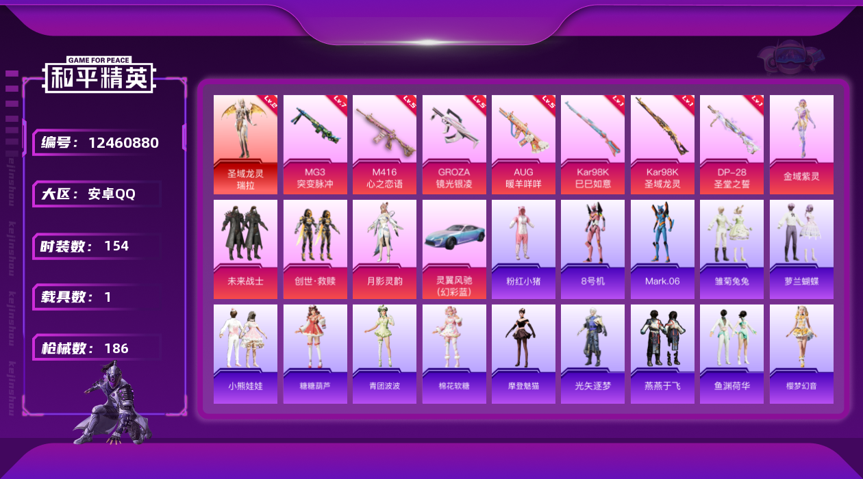 [12460880]【商品标题】:安卓 手Q-1神装-4粉装-8特效枪-1载具-3粉色飞行器-66754热力值-18王牌印记-154套装-186枪皮
