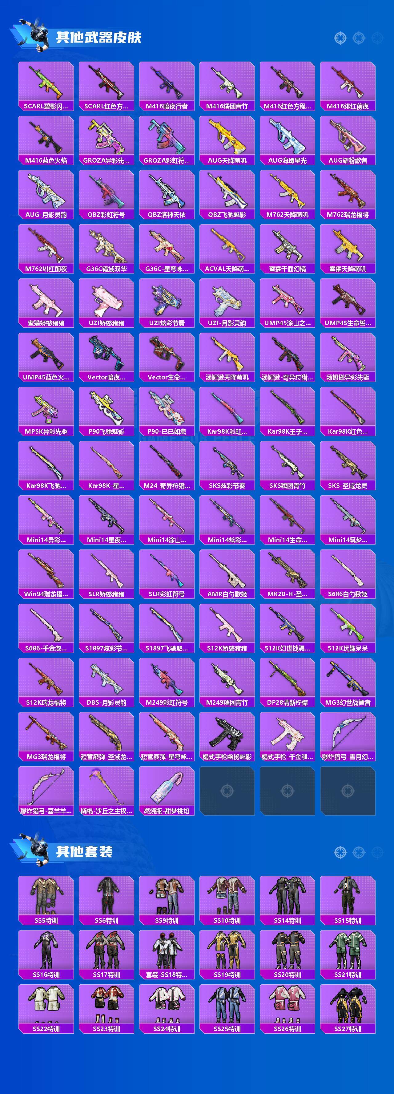 【稀有枪皮】:AKM-冰凉西瓜,AKM-夜灯,AKM-彩虹符号,AKM-环太平洋,AKM-生命誓言,AKM-缤纷海域,AKM-萌趣颜团子,AKM-虎虎生威,AKM-霓虹街区,AKM-龙的传人,M16A4-幻世战舞者,SCAR-L-玉兔迎春,SCAR-L-碧影闪光,SCAR-L-红色方程式,M416-暗夜行者,M416-糯团青竹,M416-红色方程式,M416-绯红前夜,M416-蓝色火焰,GROZA-异彩先驱,GROZA-彩虹符号,AUG-天降萌叽,AUG-海螺星光,AUG-耀粉歌者,AUG-月影灵韵,QBZ-彩虹符号,QBZ-洛