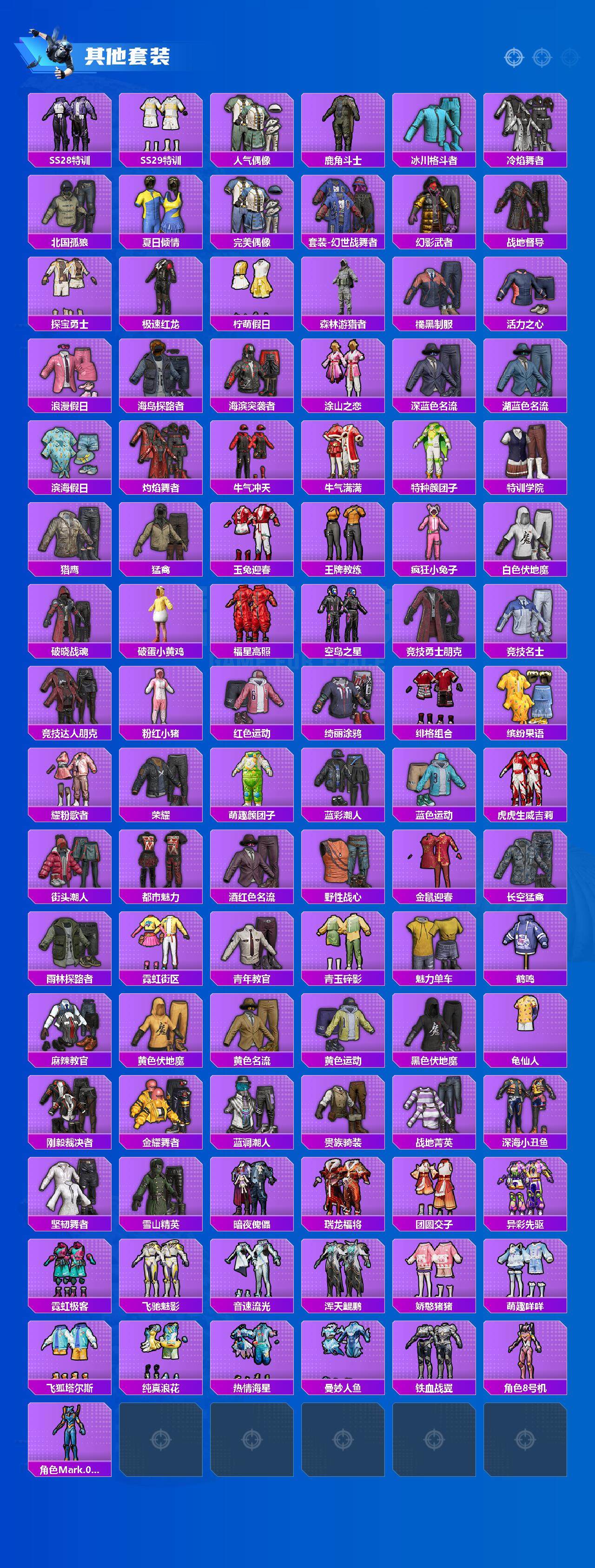 【热门品类】:套装-派对舞王,套装-深海小丑鱼,套装-SS1特训,套装-龟仙人,套装-粉红小猪,角色-8号机,角色-Mark.06