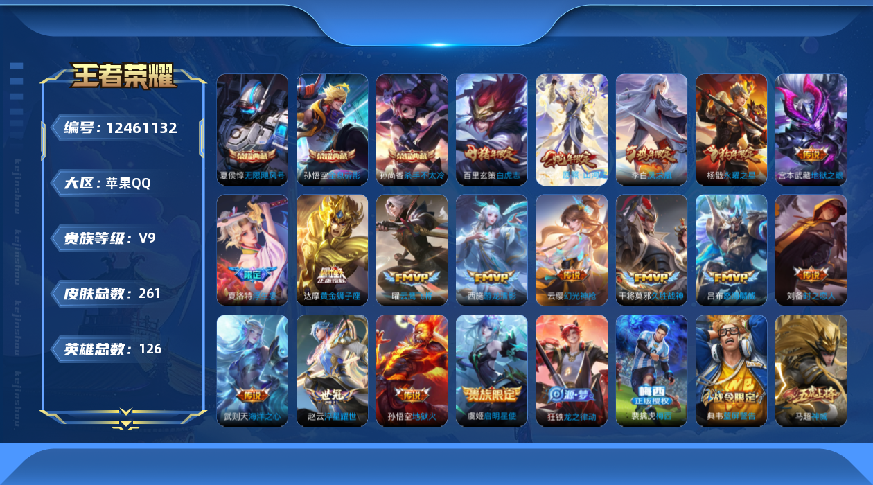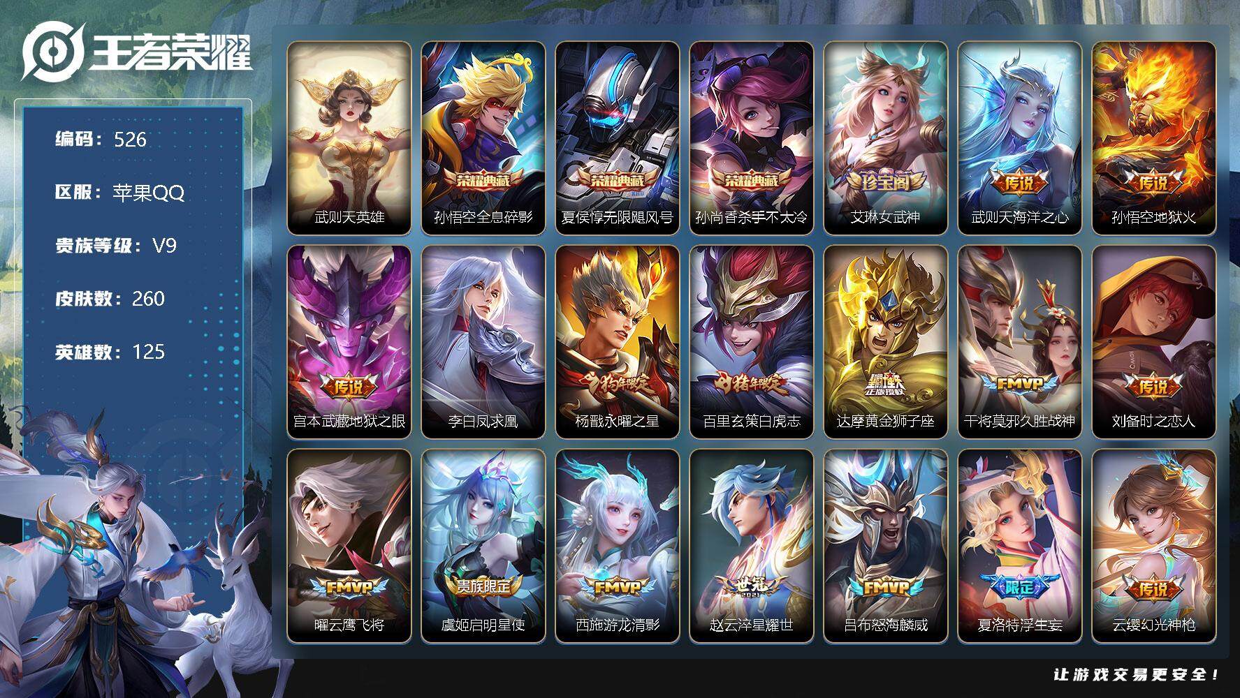 [12461132]【商品标题】:苹果Q-V9-永恒钻石IV段位-125英雄-260皮肤-3典藏-0珍品无双-0无双-0珍品传说-17传说-79史诗