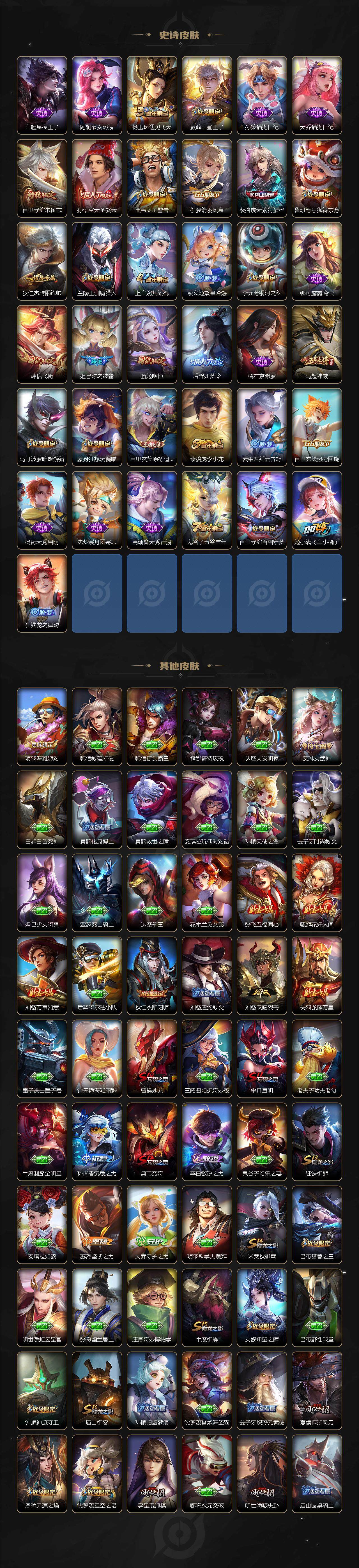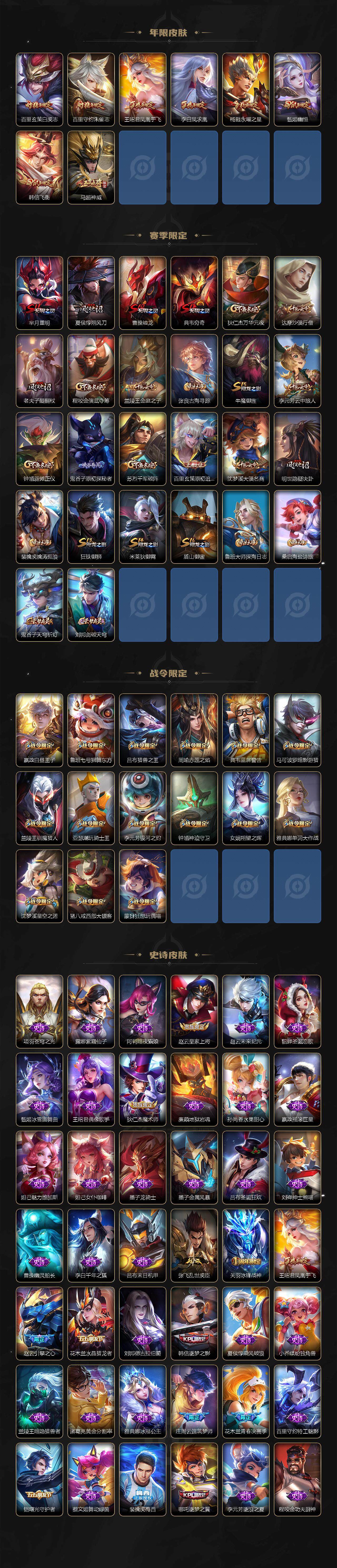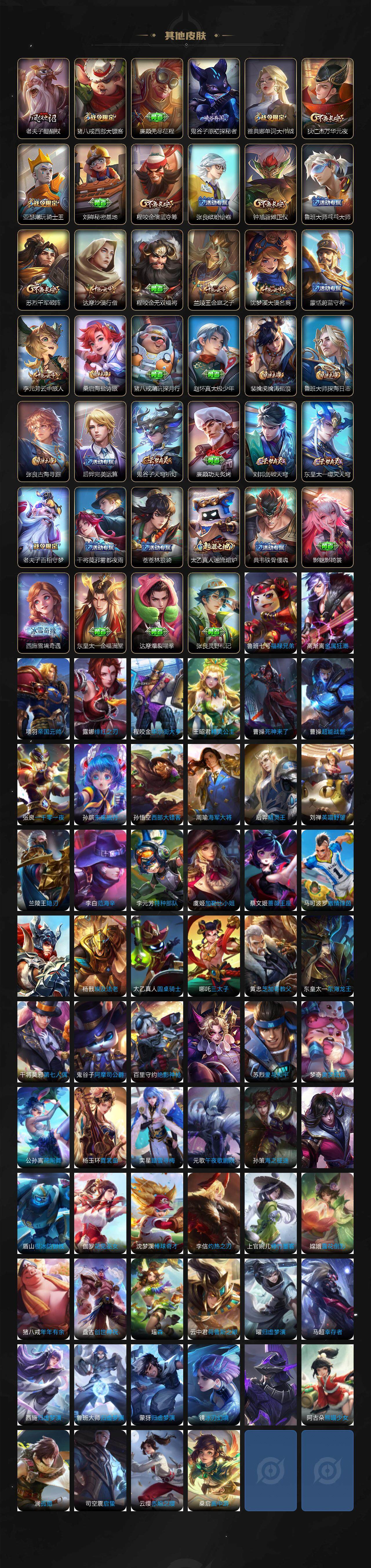 【限定皮肤】:狄仁杰阴阳师,赵云皇家上将,赵云引擎之心,妲己时之彼端,嬴政白昼王子,鲁班七号狮舞东方,庄周云端筑梦师,芈月重明,吕布猎兽之王,周瑜赤莲之焰,夏侯惇朔风刀,甄姬幽恒,曹操烛龙,典韦穷奇,典韦蓝屏警告,马可波罗暗影游猎,狄仁杰魔术师,狄仁杰万华元夜,达摩沙漠行僧,项羽海滩派对,老夫子醍醐杖,关羽冰锋战神,程咬金演武夺筹,韩信逐梦之影,韩信飞衡,王昭君凤凰于飞,兰陵王驯魔猎人,兰陵王金庭之子,花木兰青春决赛季,亚瑟潮玩骑士王,孙悟空大圣娶亲,牛魔御旌,后羿如梦令,李元芳银河之约,李元芳云中旅人,虞姬启明星使,钟馗神迹守卫,钟馗驱傩正仪,杨玉环遇见飞天,杨戬永曜之星,女娲朔望之晖,哪吒逐梦之翼,雅典娜单词大作战,蔡文姬繁星吟游,鬼谷子原初探秘者,鬼谷子五谷丰年,苏烈千军破阵,百里玄策白虎志,百里玄策原初追逐者,百里守约朱雀志,弈星混沌棋,沈梦溪星空之诺,沈梦溪大漠名商,明世隐疑决卦,裴擒虎天狼狩猎者,裴擒虎李小龙,裴擒虎擒涛扼浪,狂铁御狮,米莱狄御霄,云中君纤云弄巧,盾山御銮,猪八戒西部大镖客,上官婉儿梁祝,蒙犽狂想玩偶喵,鲁班大师探海日志,桑启海盐诗旅,夏洛特浮生妄,艾琳女武神,张良古海寻踪,裴擒虎梅西,鬼谷子天穹祈灯,刘邦剑破天穹