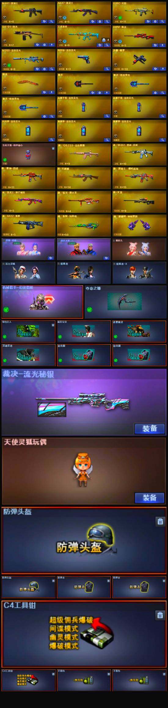 【英雄级武器】:M200-竞技荣光,柯尔特-竞技荣光,擎天-竞技荣光*2,高爆手雷-竞技荣光*2,烟雾弹-竞技荣光*2,闪光弹-竞技荣光,G36C-幻影,M4A1-黑骑士,AK47-黑武士,AWM-裁决,沙鹰-修罗,擎天,屠龙