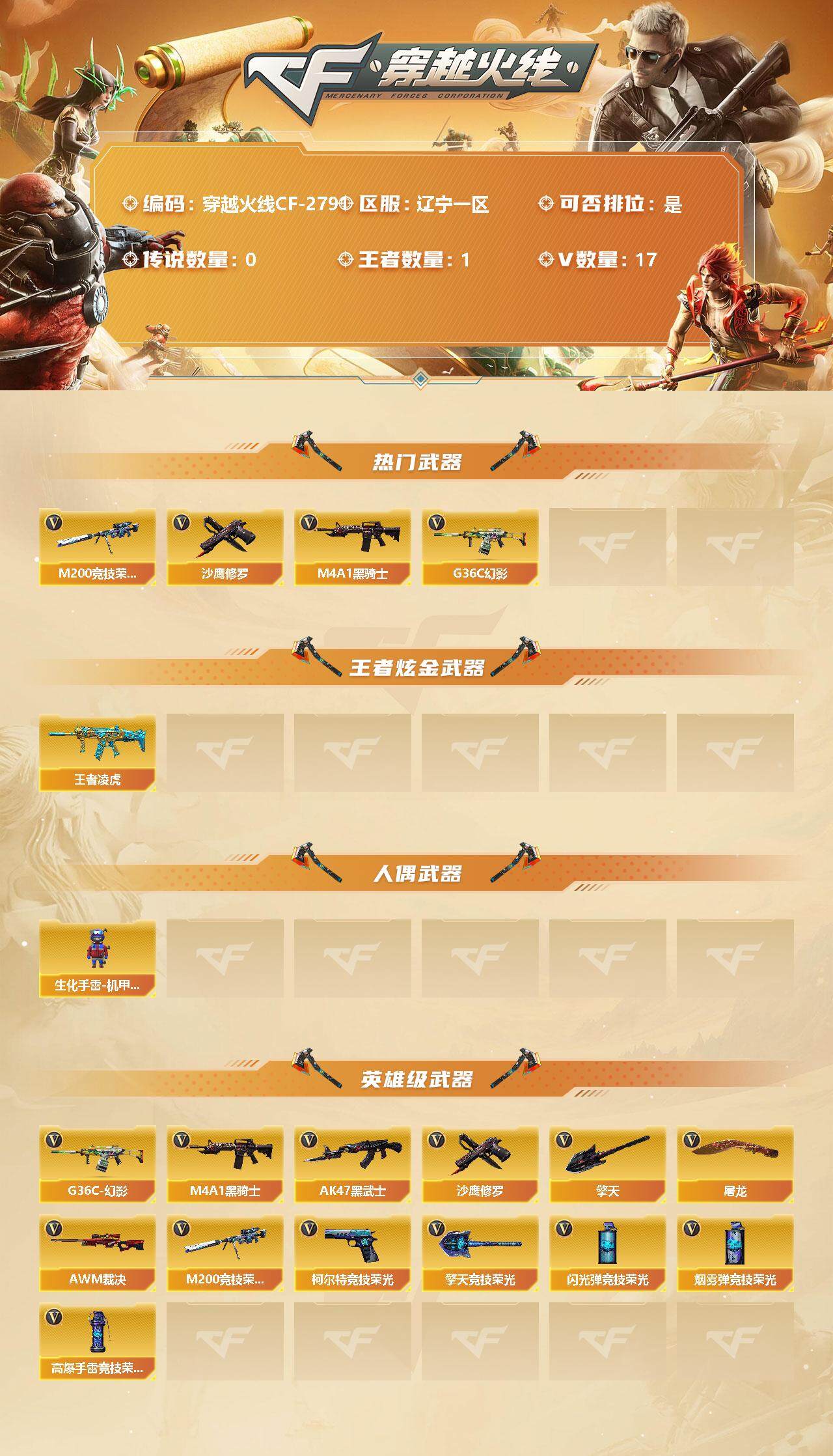 [12461699]【商品标题】:辽宁一区-17V-1王者-0炫金 【热门武器】:G36C-幻影,M200-竞技荣光,M4A1-黑骑士,沙鹰-修罗 【王者炫金武器】:王者凌虎 【人偶武器】:生化手雷-机甲核心 【英雄级武器】:M200-竞技荣光,柯尔特-竞技荣光,擎天-竞技荣光*2,高爆手雷-竞技荣光*2,烟雾弹-竞技荣光*2,闪光弹-竞技荣光,G36C-幻影,M4A1-黑骑士,AK47-黑武士,AWM-裁决,沙鹰-修罗,擎天,屠龙 【特殊枪械】:1黑骑士