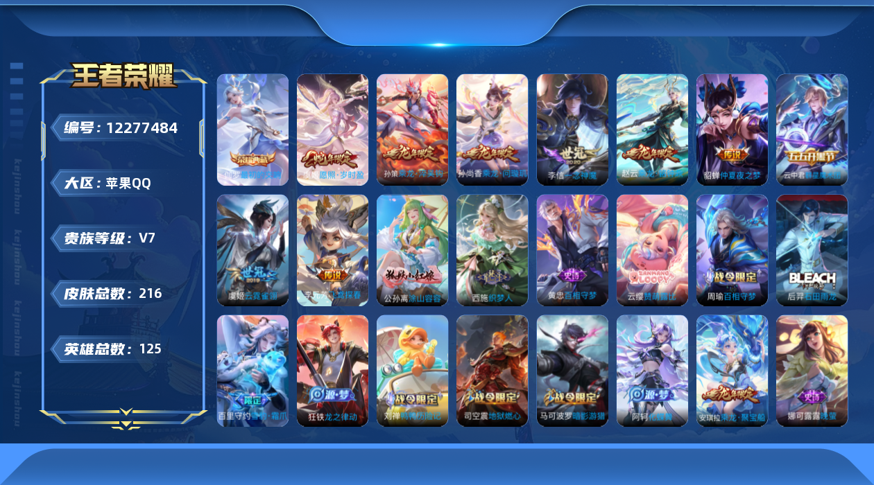 - [11527197]V7 1典藏 1传说 123英雄 171皮肤 可修改实名 优质装备:全息碎影(猴子典藏) 珍宝阁皮:妄想食味,蔷薇恋人,玩趣恶龙 限定皮:鸣野蒿,至尊宝,高山流水,五谷丰年,李小龙,辉光之辰,大圣娶亲 史诗皮:苍穹之光,电玩小子(小书包),特工魅影,冰冠公主,偶像歌手,龙骑士(小龙虾),猫狗日记-孙策,乱世虎臣,节奏热浪,女仆咖啡,摇滚巨星,水果甜心,功夫厨神,德古拉伯爵,暗隐猎兽者,幽灵船长,鬼剑武藏,逐浪之夏,曙光守护者,金属风暴,鹰眼统帅,魅力维加斯,未来纪元-赵云