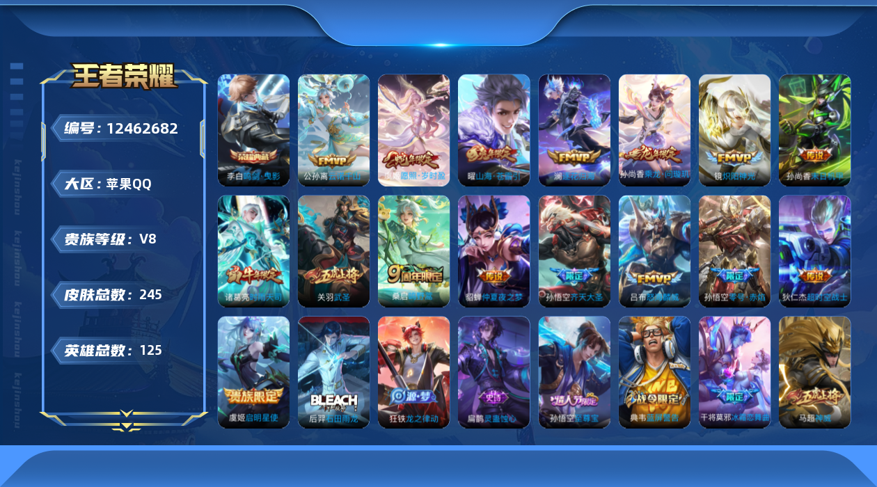 [12462682]【商品标题】:苹果Q-V8-最强王者段位-125英雄-245皮肤-1典藏-0珍品无双-0无双-0珍品传说-16传说-82史诗
