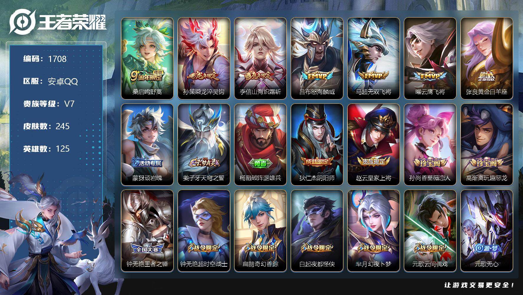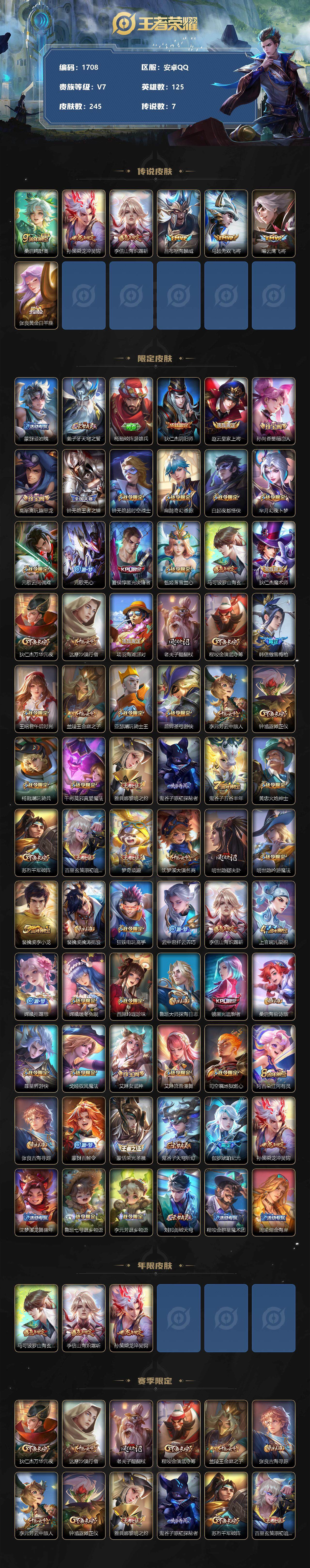 [12463245]【商品标题】:安卓Q-V7-至尊星耀I段位-125英雄-245皮肤-0典藏-0珍品无双-0无双-0珍品传说-7传说-67史诗