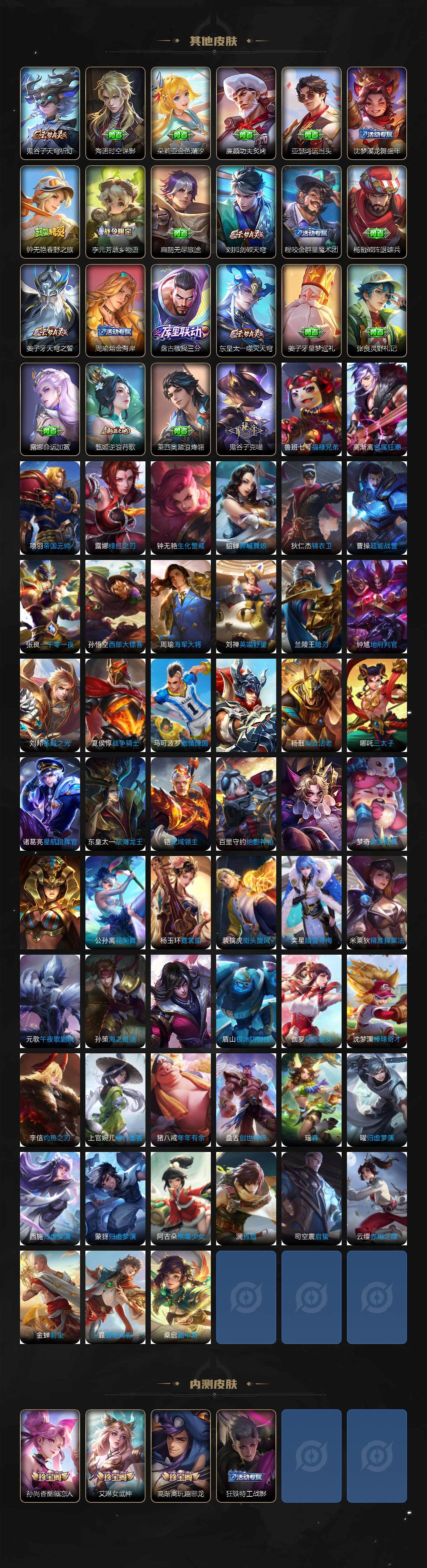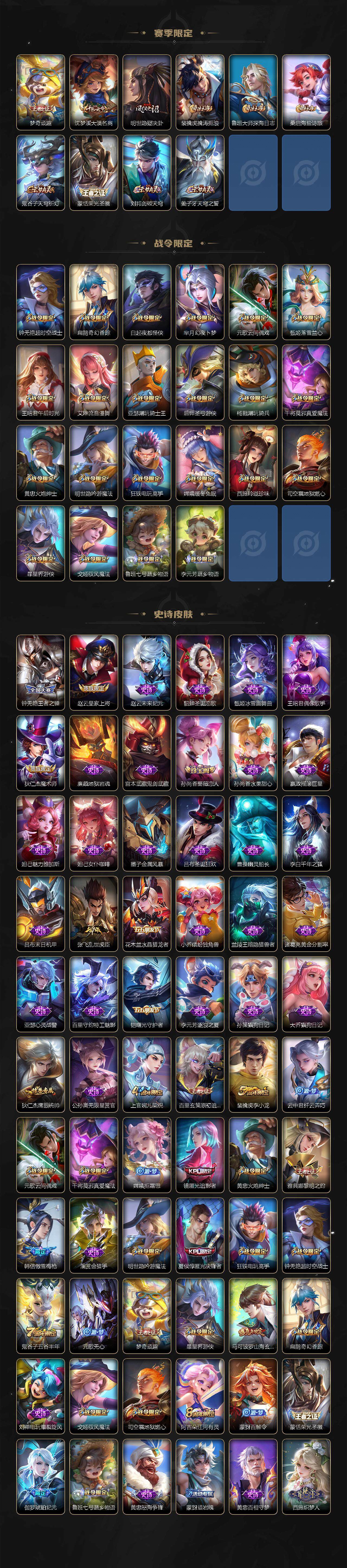 【限定皮肤】:蒙犽顽岩魄,姜子牙天穹之誓,杨戬破阵退雄兵,狄仁杰阴阳师,赵云皇家上将,孙尚香蔷薇恋人,高渐离玩趣恶龙,钟无艳王者之锤,钟无艳超时空战士,扁鹊奇幻香踪,白起夜都怪侠,芈月幻夜卜梦,元歌云间偶戏,元歌无心,夏侯惇匿光决锋者,甄姬落雪兰心,马可波罗山海玄木吟,狄仁杰魔术师,狄仁杰万华元夜,达摩沙漠行僧,项羽海滩派对,老夫子醍醐杖,程咬金演武夺筹,韩信傲雪梅枪,王昭君午后时光,兰陵王金庭之子,亚瑟潮玩骑士王,后羿圣弓游侠,李元芳云中旅人,钟馗驱傩正仪,杨戬潮玩骑兵,干将莫邪真爱魔法,雅典娜黎明之约,鬼谷子原初探秘者,鬼谷子五谷丰年,黄忠火炮绅士,苏烈千军破阵,百里玄策原初追逐者,梦奇顽趣,沈梦溪大漠名商,明世隐疑决卦,明世隐吟游魔法,裴擒虎李小龙,裴擒虎擒涛扼浪,狂铁电玩高手,云中君纤云弄巧,李信山海炽霜斩,上官婉儿梁祝,嫦娥拒霜思,嫦娥暖冬兔眠,西施玲珑珍味,鲁班大师探海日志,镜匿光追影者,桑启海盐诗旅,暃星界游侠,戈娅驭风魔法,艾琳女武神,艾琳流音漫舞,司空震地狱燃心,阿古朵江河有灵,张良古海寻踪,蒙犽百解令,蒙恬荣光圣徽,鬼谷子天穹祈灯,伽罗琥珀纪元,孙策乘龙淬吴钩,沈梦溪龙舞盛年,鲁班七号蔬乡物语,李元芳蔬乡物语,刘邦剑破天穹,程咬金群星魔术团,周瑜熔金海岸