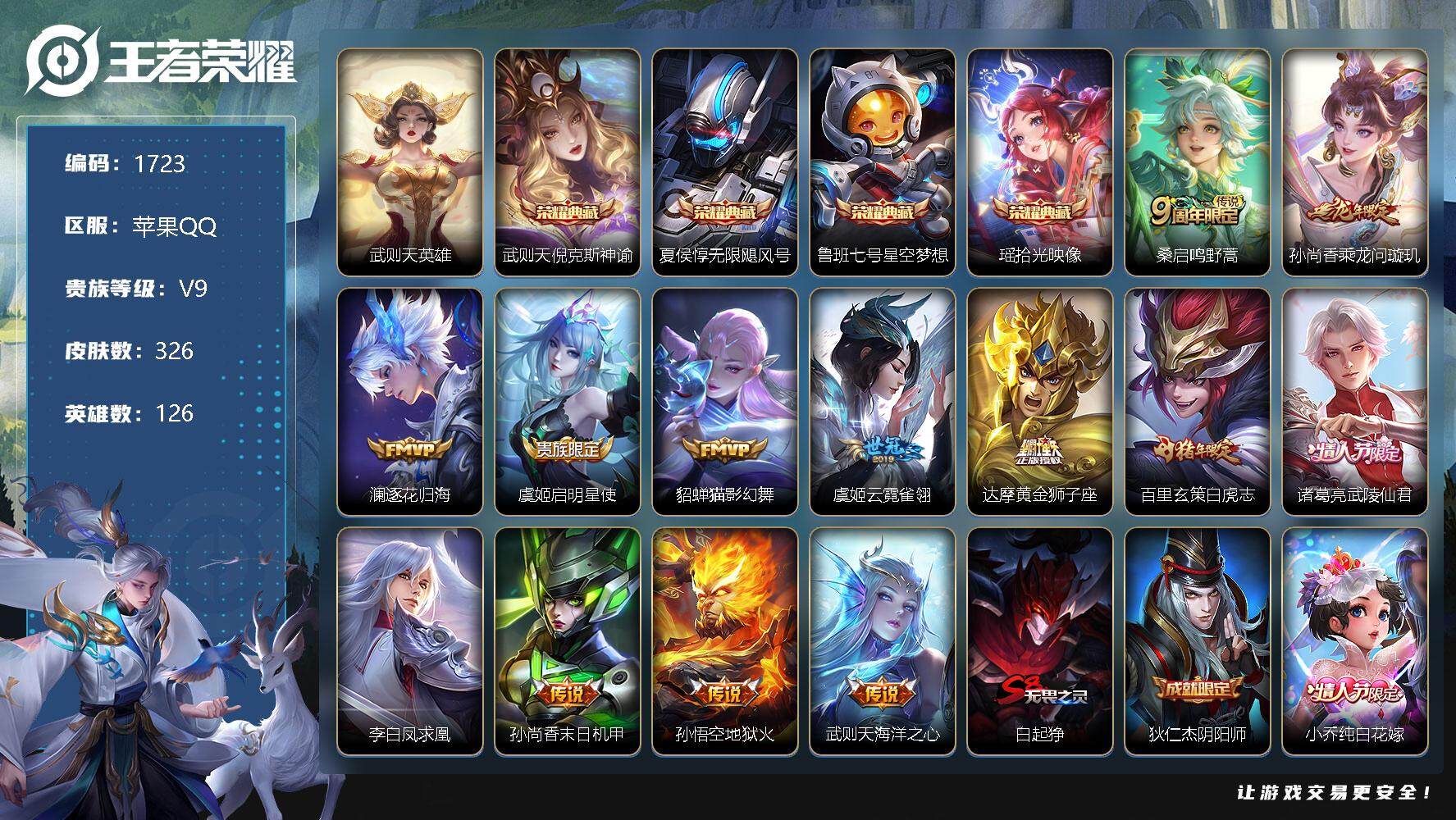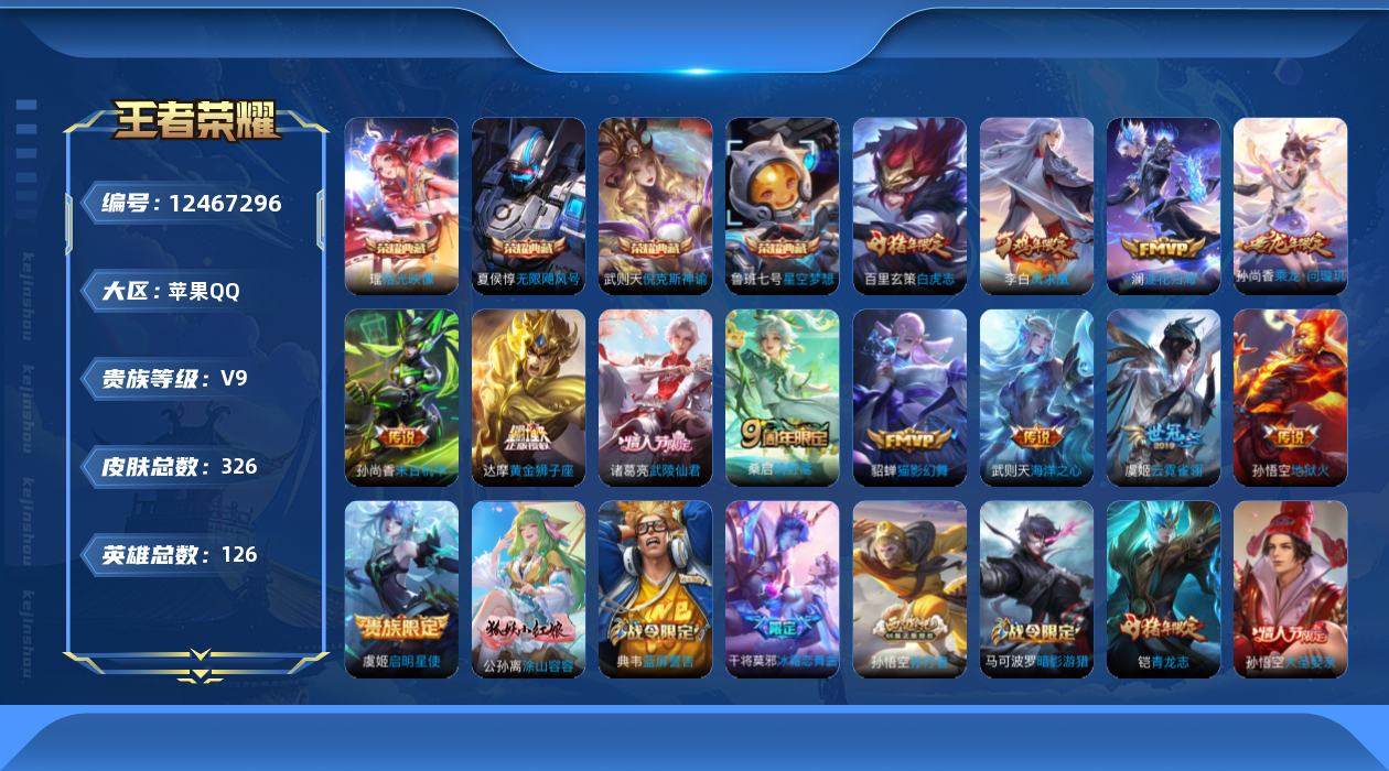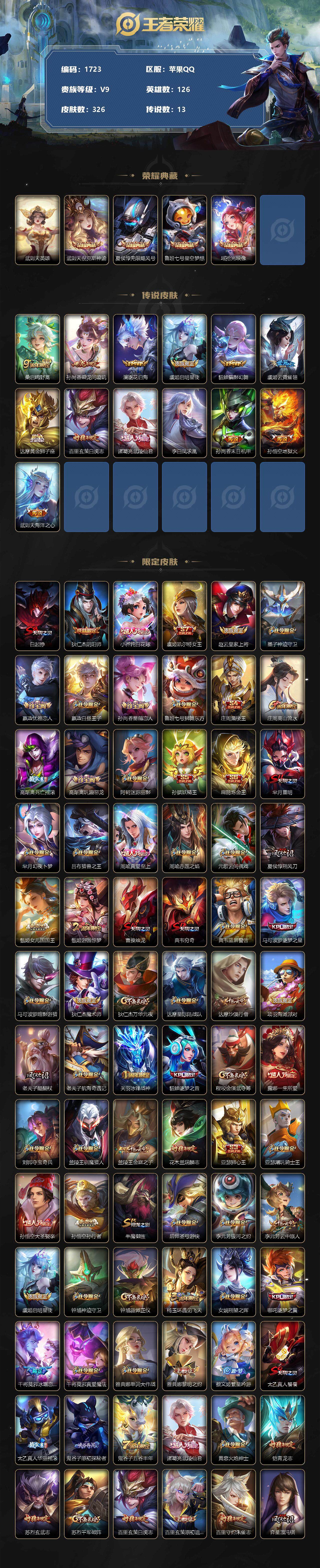 [12467296]【商品标题】:苹果Q-V9-最强王者段位-126英雄-326皮肤-4典藏-0珍品无双-0无双-0珍品传说-13传说-94史诗