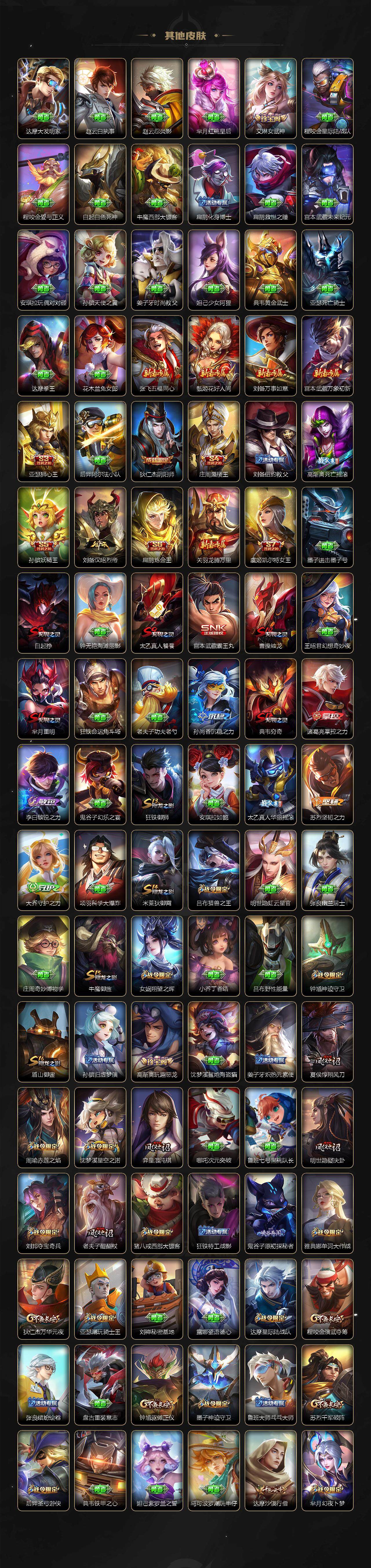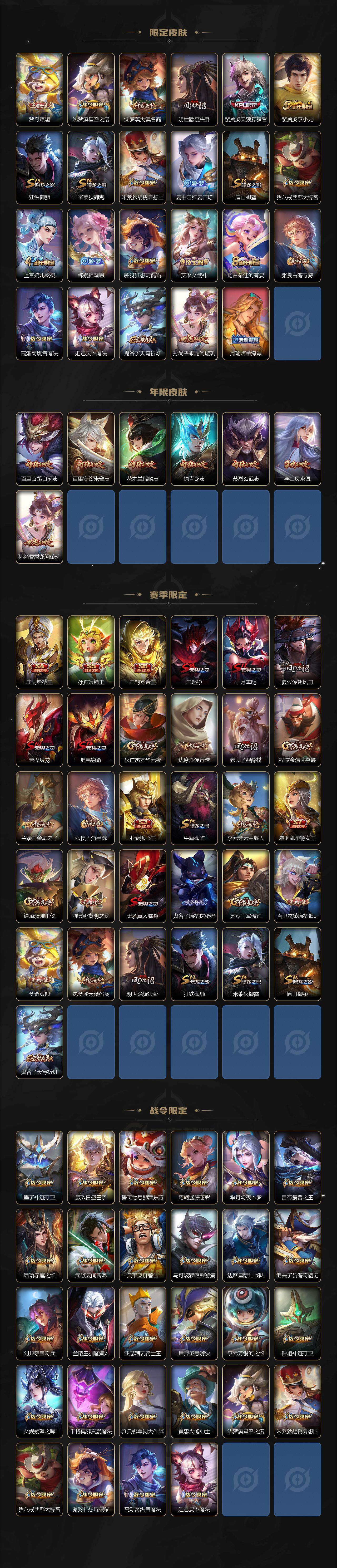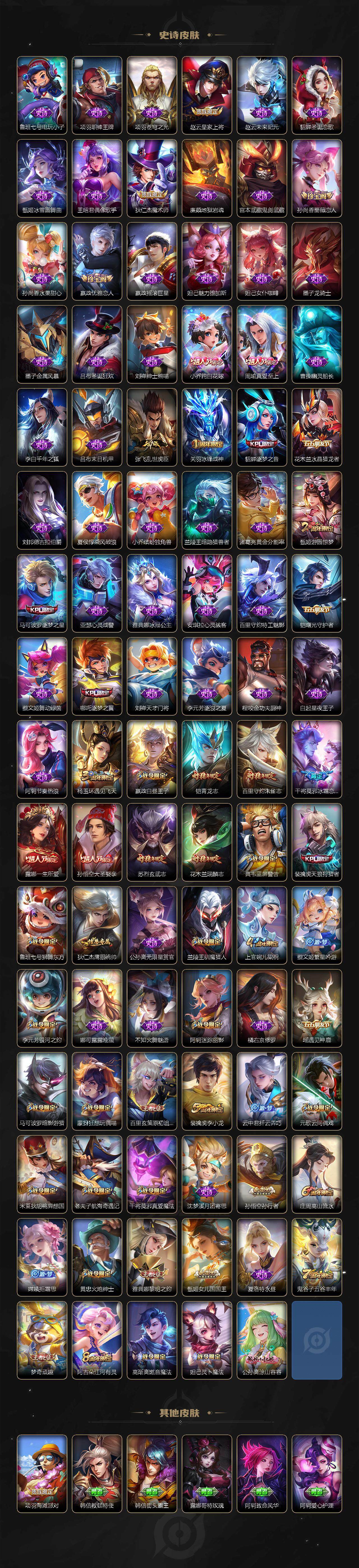 【限定皮肤】:白起狰,狄仁杰阴阳师,小乔纯白花嫁,虞姬凯尔特女王,赵云皇家上将,墨子神迹守卫,嬴政优雅恋人,嬴政白昼王子,孙尚香蔷薇恋人,鲁班七号狮舞东方,庄周蜃楼王,庄周高山流水,高渐离死亡摇滚,高渐离玩趣恶龙,阿轲迷踪丽影,孙膑妖精王,扁鹊炼金王,芈月重明,芈月幻夜卜梦,吕布猎兽之王,周瑜真爱至上,周瑜赤莲之焰,元歌云间偶戏,夏侯惇朔风刀,甄姬女儿国国王,甄姬游园惊梦,曹操烛龙,典韦穷奇,典韦蓝屏警告,马可波罗逐梦之星,马可波罗暗影游猎,狄仁杰魔术师,狄仁杰万华元夜,达摩星际陆战队,达摩沙漠行僧,项羽海滩派对,老夫子醍醐杖,老夫子航海奇遇记,关羽冰锋战神,貂蝉逐梦之音,程咬金演武夺筹,露娜一生所爱,刘邦夺宝奇兵,兰陵王驯魔猎人,兰陵王金庭之子,花木兰瑞麟志,亚瑟狮心王,亚瑟潮玩骑士王,孙悟空大圣娶亲,孙悟空孙行者,牛魔御旌,后羿圣弓游侠,李元芳银河之约,李元芳云中旅人,虞姬启明星使,钟馗神迹守卫,钟馗驱傩正仪,杨玉环遇见飞天,女娲朔望之晖,哪吒逐梦之翼,干将莫邪冰霜恋舞曲,干将莫邪真爱魔法,雅典娜单词大作战,雅典娜黎明之约,蔡文姬繁星吟游,太乙真人饕餮,太乙真人华丽摇滚,鬼谷子原初探秘者,鬼谷子五谷丰年,诸葛亮武陵仙君,黄忠火炮绅士,铠青龙志,苏烈玄武志,苏烈千军破阵,百里玄策白虎志,百里玄策原初追逐者,百里守约朱雀志,弈星混沌棋,梦奇顽趣,沈梦溪星空之诺,沈梦溪大漠名商,明世隐疑决卦,裴擒虎天狼狩猎者,裴擒虎李小龙,狂铁御狮,米莱狄御霄,米莱狄胡桃异想国,云中君纤云弄巧,盾山御銮,猪八戒西部大镖客,上官婉儿梁祝,嫦娥拒霜思,蒙犽狂想玩偶喵,艾琳女武神,阿古朵江河有灵,张良古海寻踪,高渐离燃音魔法,妲己灵卜魔法,鬼谷子天穹祈灯,孙尚香乘龙问璇玑,周瑜熔金海岸