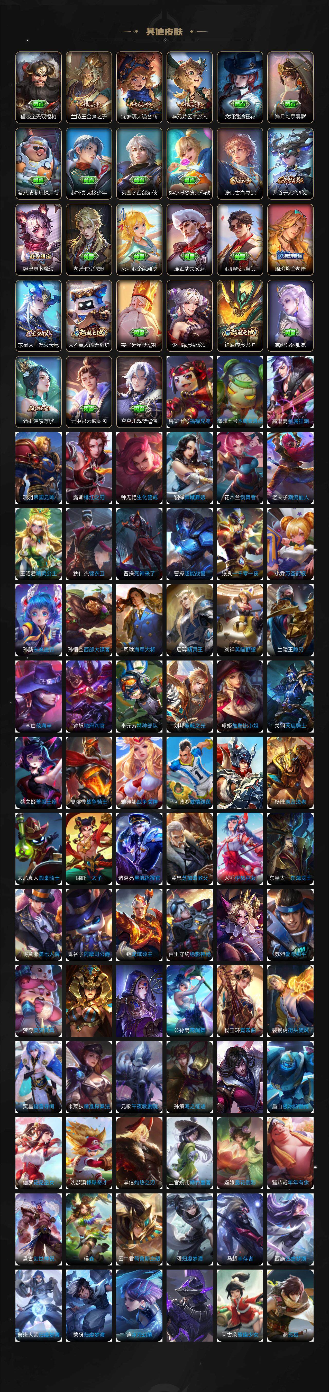 亚瑟狮心王,庄周蜃楼王,孙膑妖精王,扁鹊炼金王,虞姬凯尔特女王,白起狰,太乙真人饕餮,曹操烛龙,芈月重明,典韦穷奇,狂铁御狮,米莱狄御霄,牛魔御旌,盾山御銮,夏侯惇朔风刀,明世隐疑决卦,老夫子醍醐杖,鬼谷子原初探秘者,狄仁杰万华元夜,程咬金演武夺筹,钟馗驱傩正仪,苏烈千军破阵,吕布猎兽之王,嬴政白昼王子,女娲朔望之晖,典韦蓝屏警告,钟馗神迹守卫,鲁班七号狮舞东方,沈梦溪星空之诺,李元芳银河之约,刘邦夺宝奇兵,马可波罗暗影游猎,蒙犽狂想玩偶喵,元歌云间偶戏,弈星混沌棋,达摩沙漠行僧,兰陵王金庭之子,沈梦溪大漠名商,李元芳云中旅人,张良古海寻踪