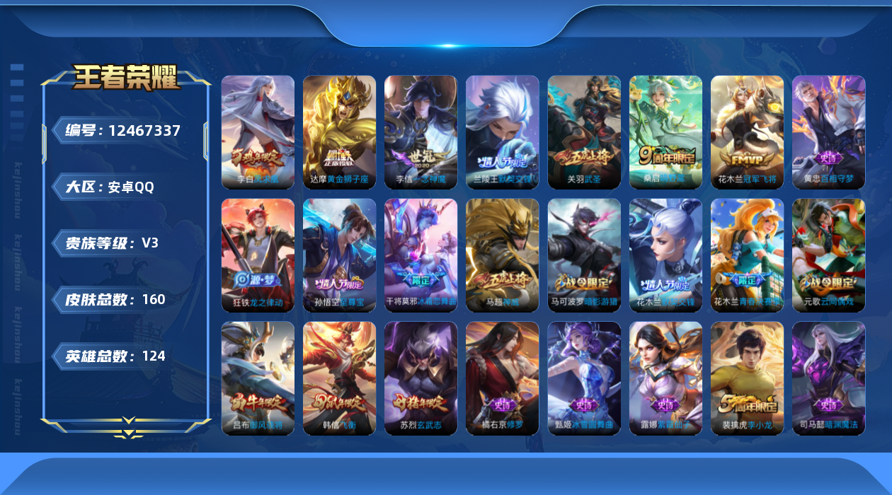 - [12042773]【特价急出/详情看图】:安卓Q-V7-至尊星耀I段位-125英雄-239皮肤-9传说-67史诗 【传说皮肤】:澜愿照九州拓,云缨幻光神枪,夏洛特浮生妄,曜山海苍雷引,李白诗剑行,赵云淬星耀世,诸葛亮时雨天司,李信一念神魔,狄仁杰超时空战士 【限定皮肤】:白起狰,狄仁杰阴阳师,赵云皇家上将,嬴政优雅恋人,孙尚香蔷薇恋人,鲁班七号狮舞东方,庄周高山流水,高渐离死亡摇滚,阿轲迷踪丽影,芈月重明,芈月幻夜卜梦,吕布御风骁将,周瑜赤莲之焰,元歌云间偶戏,元歌无心,夏侯惇朔风刀,曹操烛龙,典韦穷奇,马可波罗逐梦之星,马可波罗暗影游猎,狄仁杰魔术师,狄仁杰万华元夜,达摩星际陆战队,达摩沙漠行僧,项羽海滩派对,老夫子醍醐杖,程咬金演武夺筹,刘邦夺宝奇兵,兰陵王驯魔猎人,兰陵王金庭之子,亚瑟潮玩骑士王,牛魔御旌,后羿圣弓游侠,李元芳云中旅人,钟馗神迹守卫,钟馗驱傩正仪,杨玉环遇见飞天,干将莫邪真爱魔法,雅典娜单词大作战,雅典娜黎明之约,蔡文姬繁星吟游,太乙真人饕餮,太乙真人华丽摇滚,鬼谷子原初探秘者,鬼谷子五谷丰年,诸葛亮时雨天司,黄忠火炮绅士,苏烈千军破阵,百里玄策原初追逐者,弈星混沌棋,梦奇顽趣,沈梦溪大漠名商,明世隐疑决卦,裴擒虎李小龙,裴擒虎擒涛扼浪,狂铁御狮,米莱狄御霄,米莱狄胡桃异想国,云中君纤云弄巧,盾山御銮,猪八戒西部大镖客,上官婉儿梁祝,嫦娥拒霜思,曜山海苍雷引,蒙犽狂想玩偶喵,鲁班大师探海日志,镜匿光追影者,桑启海盐诗旅,夏洛特浮生妄,艾琳女武神,张良古海寻踪,蒙恬荣光圣徽,高渐离燃音魔法,妲己灵卜魔法,鬼谷子天穹祈灯,伽罗琥珀纪元,刘邦剑破天穹,程咬金群星魔术团,周瑜熔金海岸 【年限皮肤】:吕布御风骁将,诸葛亮时雨天司,曜山海苍雷引 【赛季限定】:白起狰,芈月重明,夏侯惇朔风刀,曹操烛龙,典韦穷奇,狄仁杰万华元夜,达摩沙漠行僧,老夫子醍醐杖,程咬金演武夺筹,兰陵王金庭之子,张良古海寻踪,牛魔御旌,李元芳云中旅人,钟馗驱傩正仪,雅典娜黎明之约,太乙真人饕餮,鬼谷子原初探秘者,苏烈千军破阵,百里玄策原初追逐者,弈星混沌棋,梦奇顽趣,沈梦溪大漠名商,明世隐疑决卦,裴擒虎擒涛扼浪,狂铁御狮,米莱狄御霄,盾山御銮,鲁班大师探海日志,桑启海盐诗旅,鬼谷子天穹祈灯,蒙恬荣光圣徽,刘邦剑破天穹 【战令限定】:鲁班七号狮舞东方,阿轲迷踪丽影,芈月幻夜卜梦,周瑜赤莲之焰,元歌云间